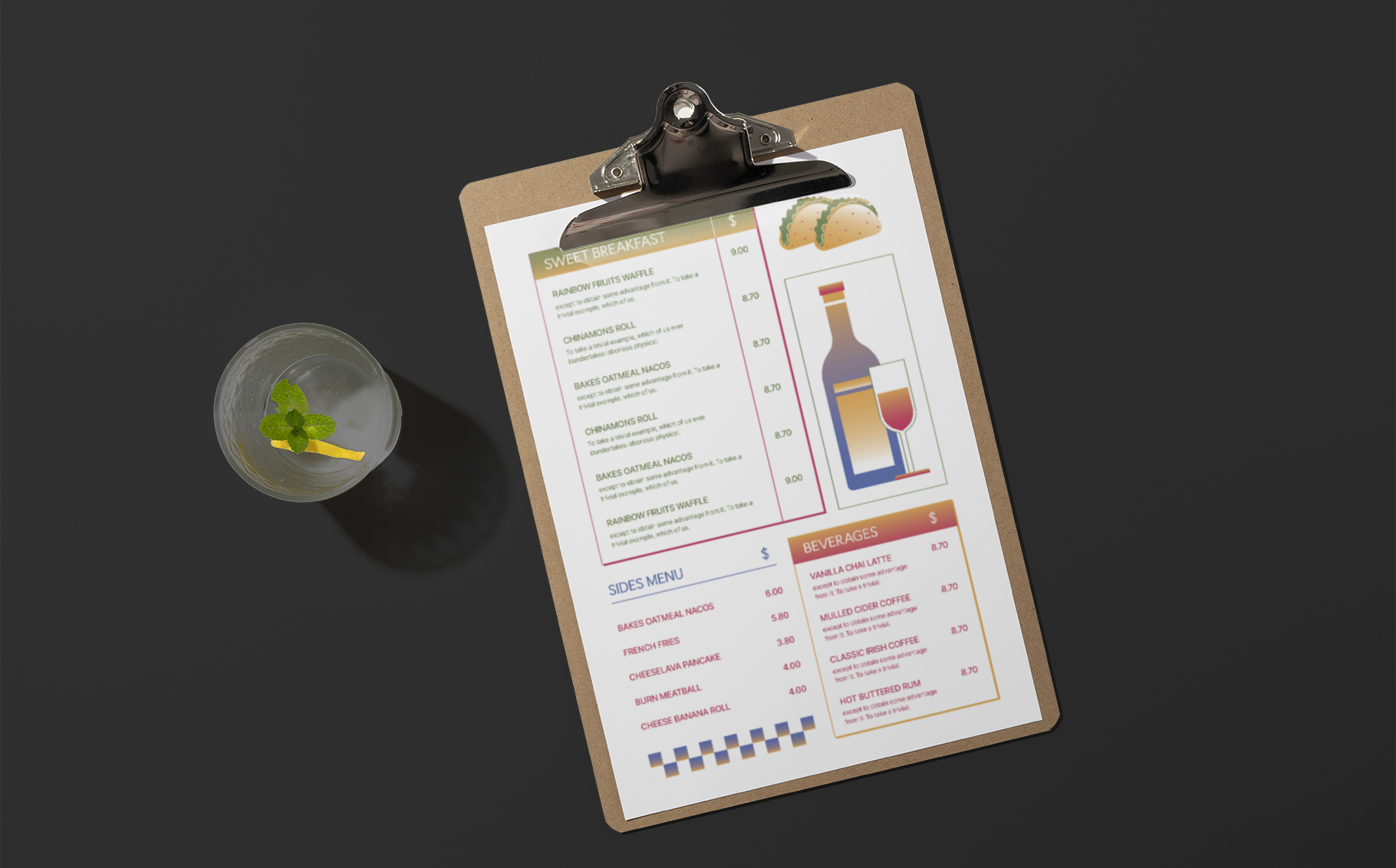 Want to make a restaurant or cafe? It would be best to consider using these menu templates to match your restaurant. It's easy to use with only a few clicks and saves your time from designing a menu from scratch. These templates are professionally made based on real-life possibilities, so you can expect them to match your needs.