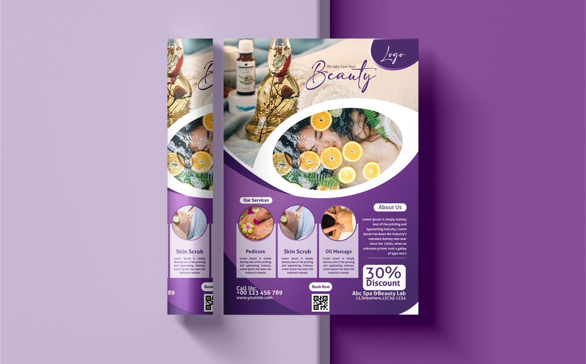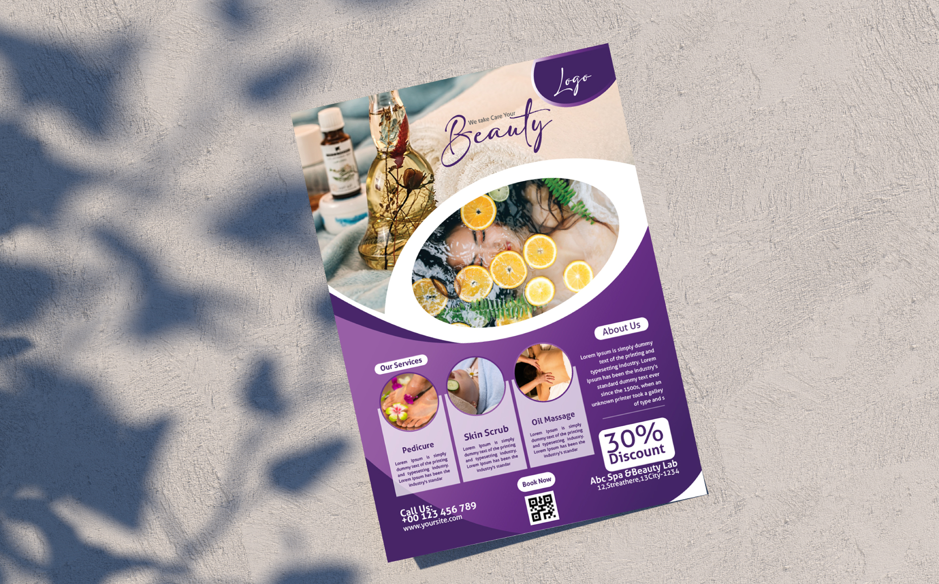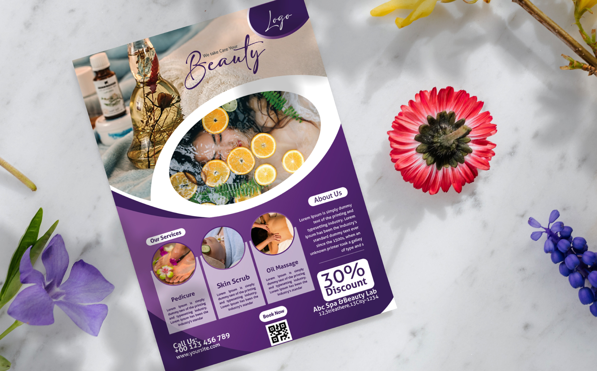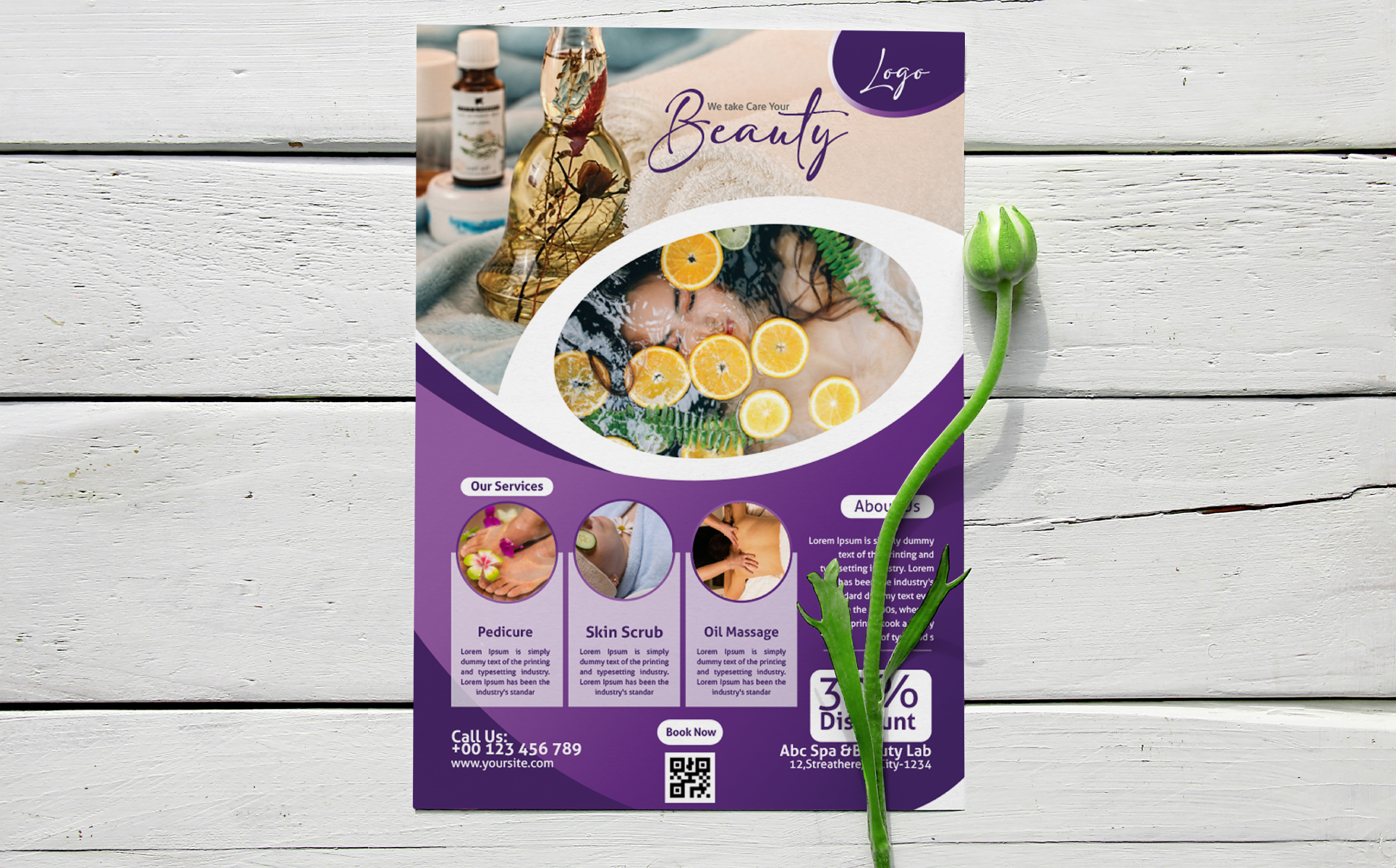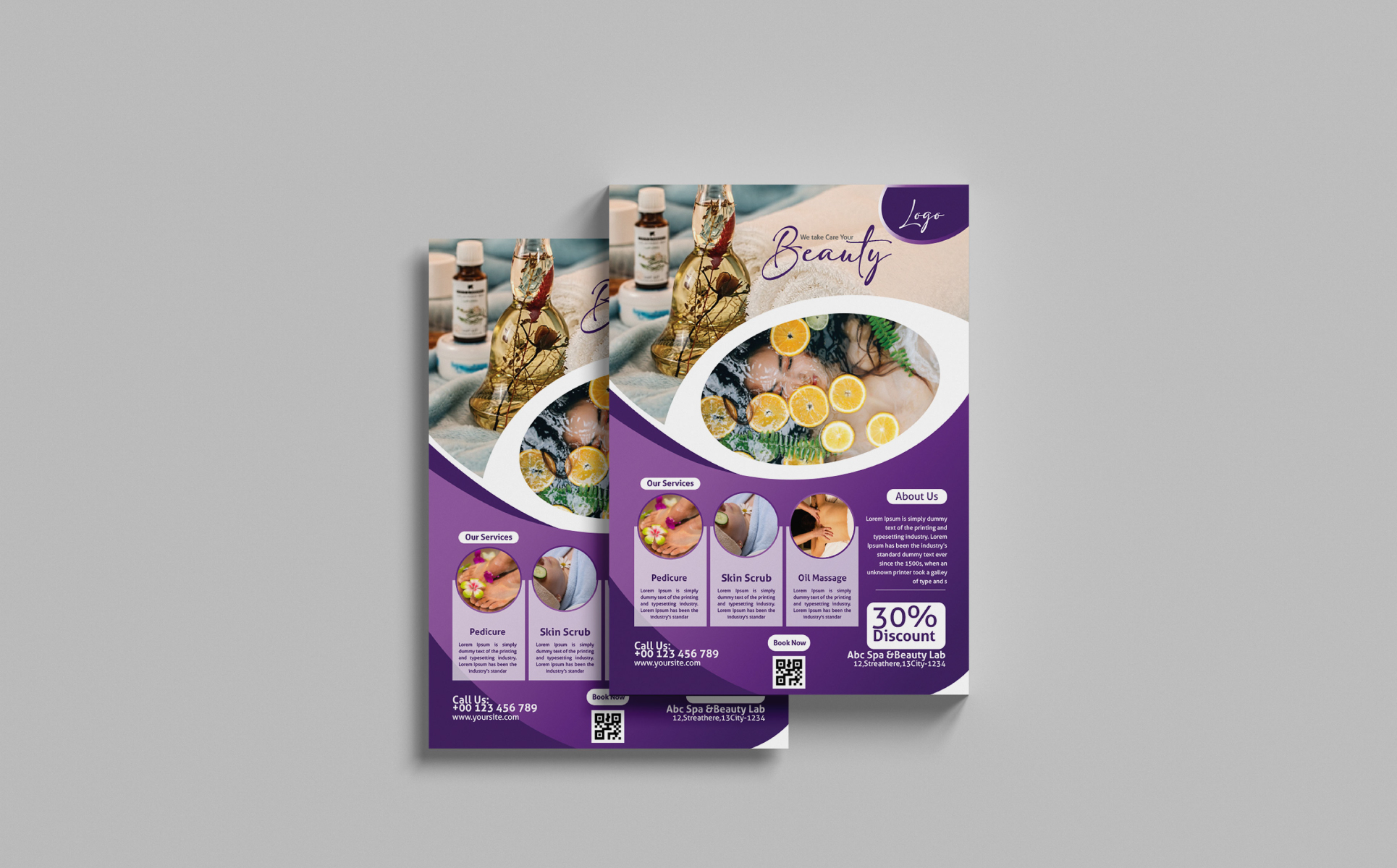 A clean and modern design perfect for promoting spa services, beauty salons, wellness centers, and skincare treatments. Featuring a minimalist layout with soothing pastel colors, stylish typography, and ample space for service details and contact information. Fully customizable and print-ready, ideal for professional branding and marketing."