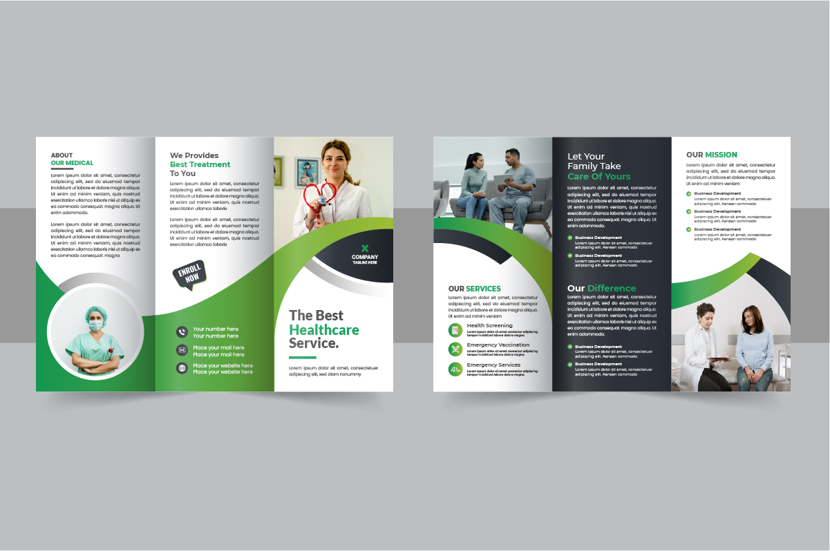 Healthcare or medical trifold brochure or business trifold brochure. All type of Corporate business company, agricultural Company, Home Sale, Land Sale or other property selling company could use this Healthcare or medical trifold brochure or business trifold brochure