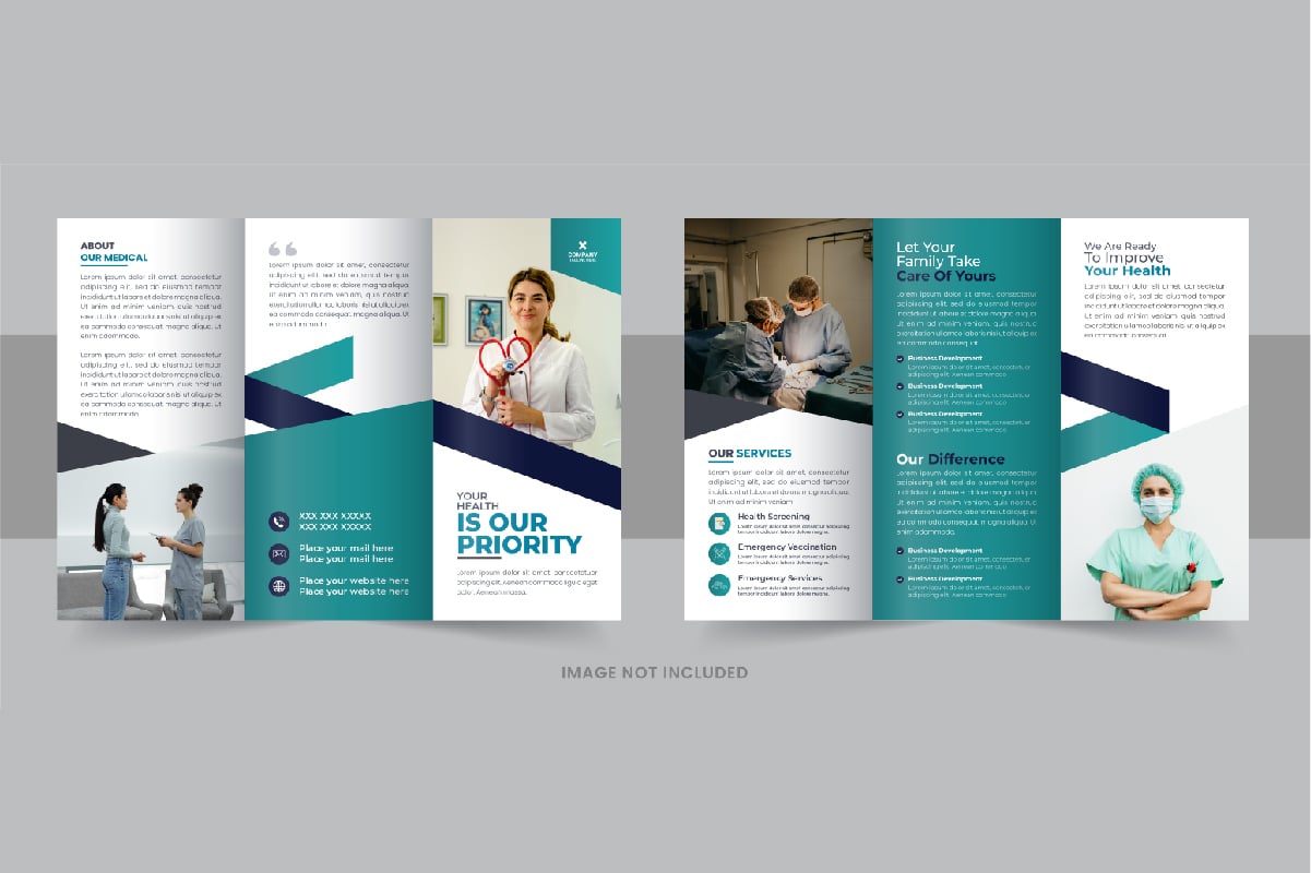 Modern healthcare or medical service trifold brochure template layout. All type of Corporate business company, agricultural Company, Home Sale, Land Sale or other property selling company could use this Healthcare or medical service trifold brochure template layout