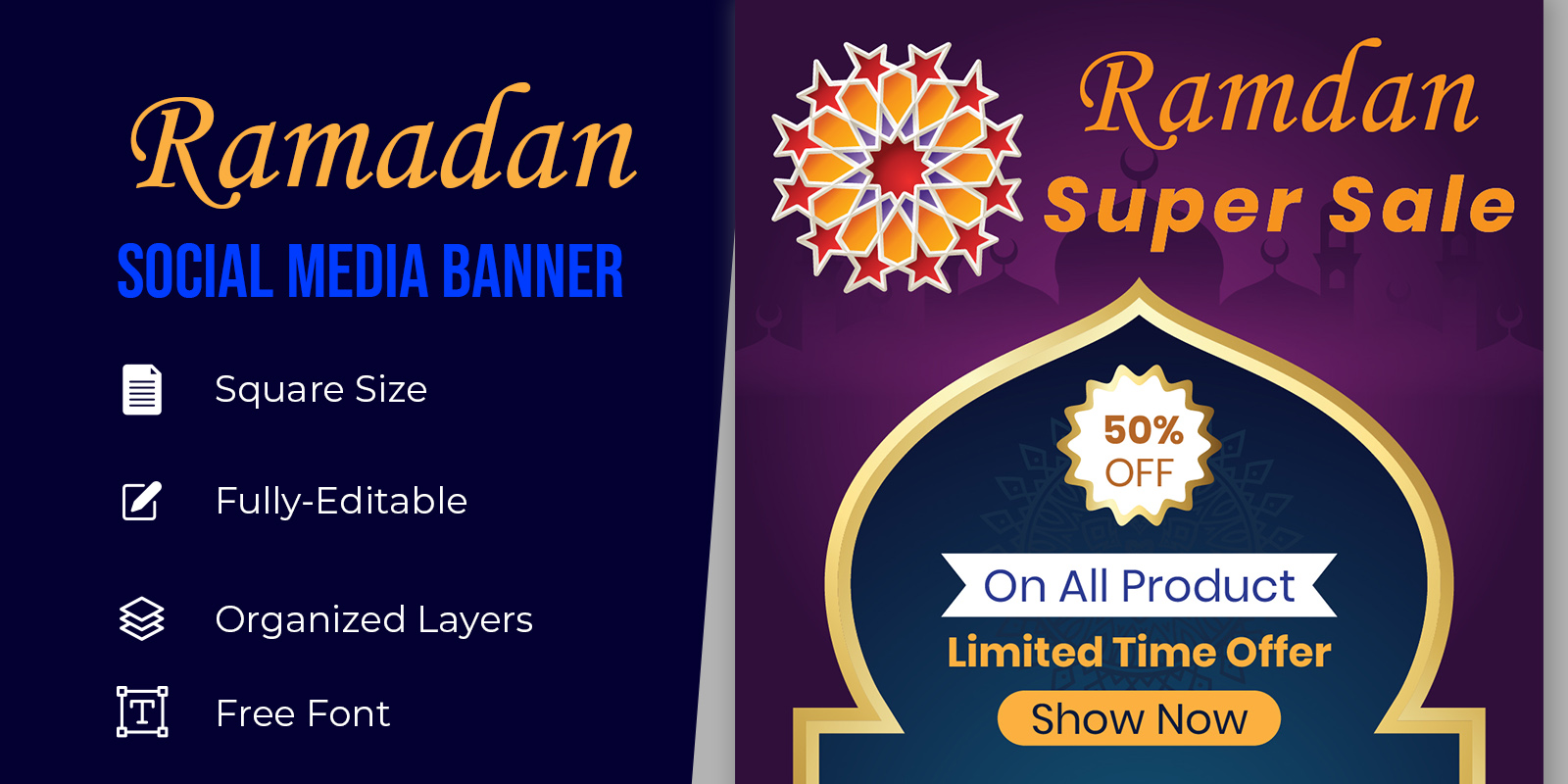 Ramadan sale social media post template banners ad, Eid Mubarak Sale with Flat 50% Off, Suitable for Greeting Card, Banner, Event Backdrop, Social Media, And Other Muslim Related Occasion.