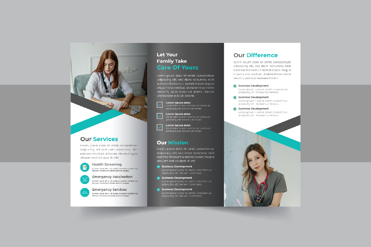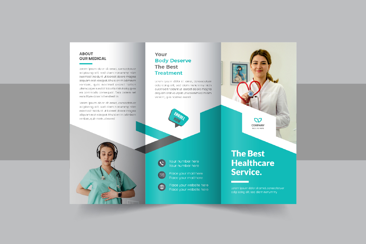 Hospital medical or healthcare trifold brochure, Business or company trifold brochure template design. All type of Corporate business company, agricultural Company, Home Sale, Land Sale or other property selling company could use this Hospital medical or healthcare trifold brochure, Business or company trifold brochure template design