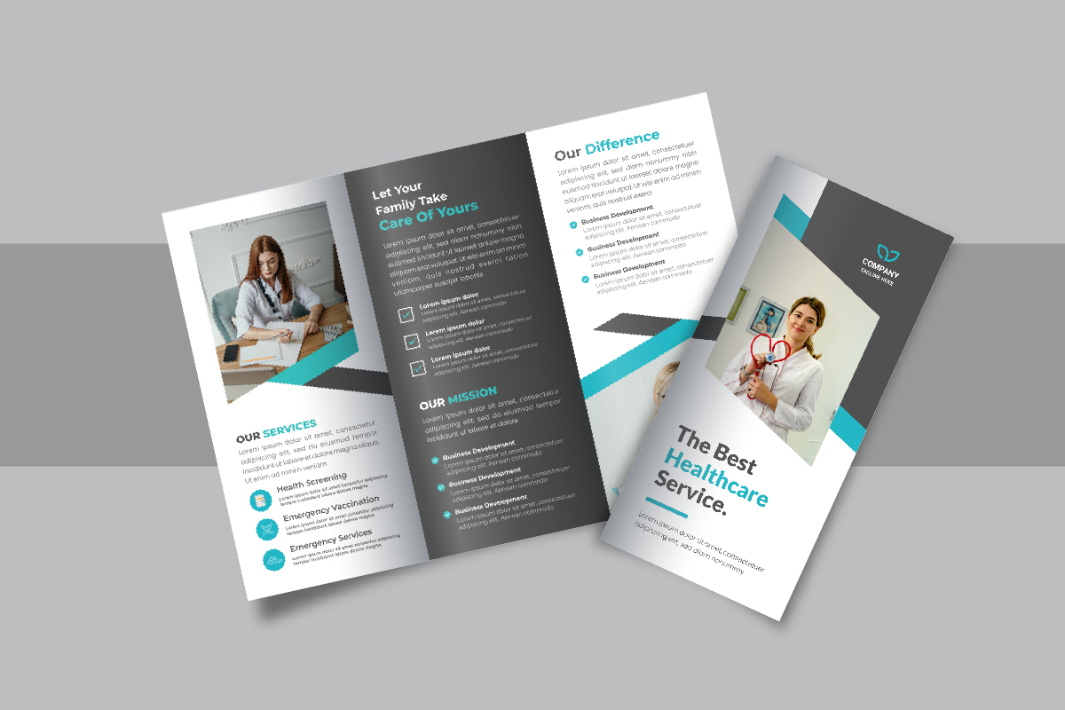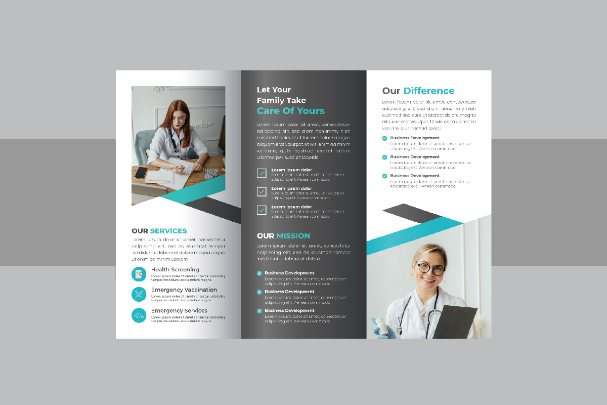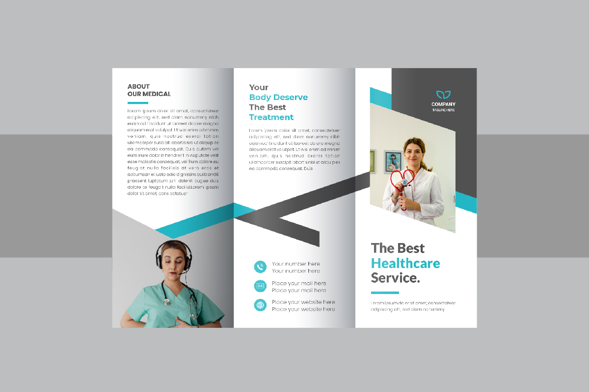 Hospital medical or healthcare trifold brochure, Business or company trifold brochure template design. All type of Corporate business company, agricultural Company, Home Sale, Land Sale or other property selling company could use this Hospital medical or healthcare trifold brochure, Business or company trifold brochure template design