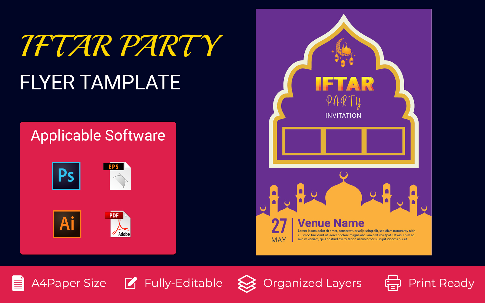 Ifter Party invitation flyer design. Ramadan flyer for ifter party and seminar. Iftar party celebration poster, banner, ftar banner or flyer design, ramadan flyer, ifter party