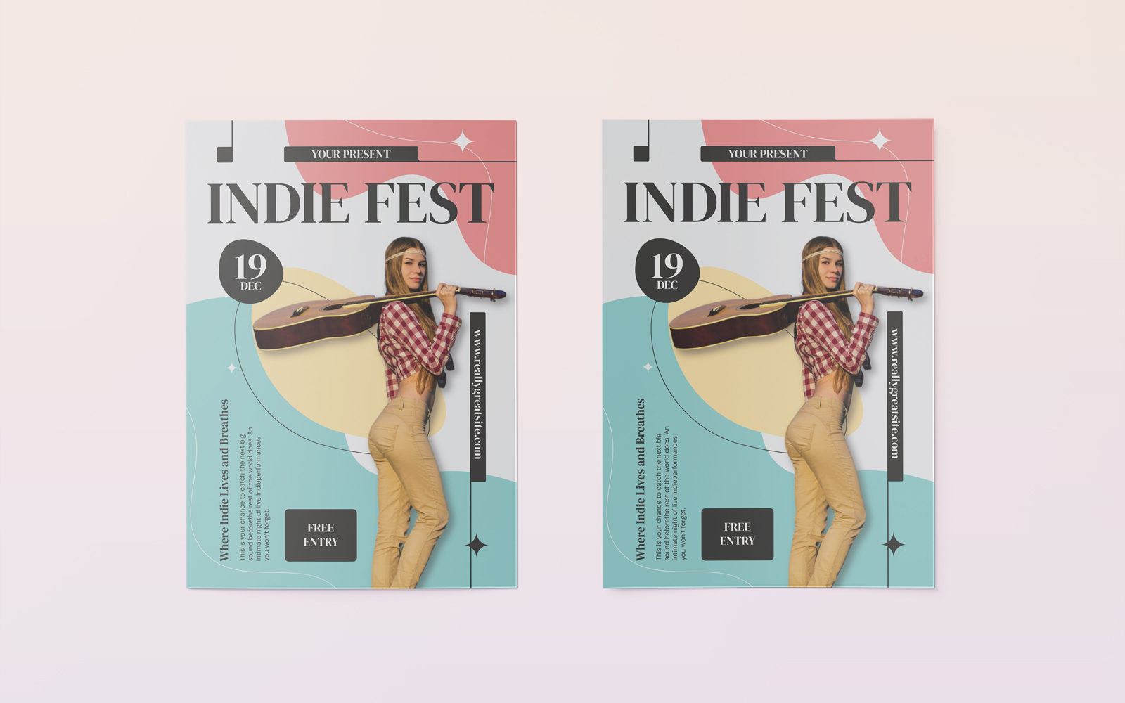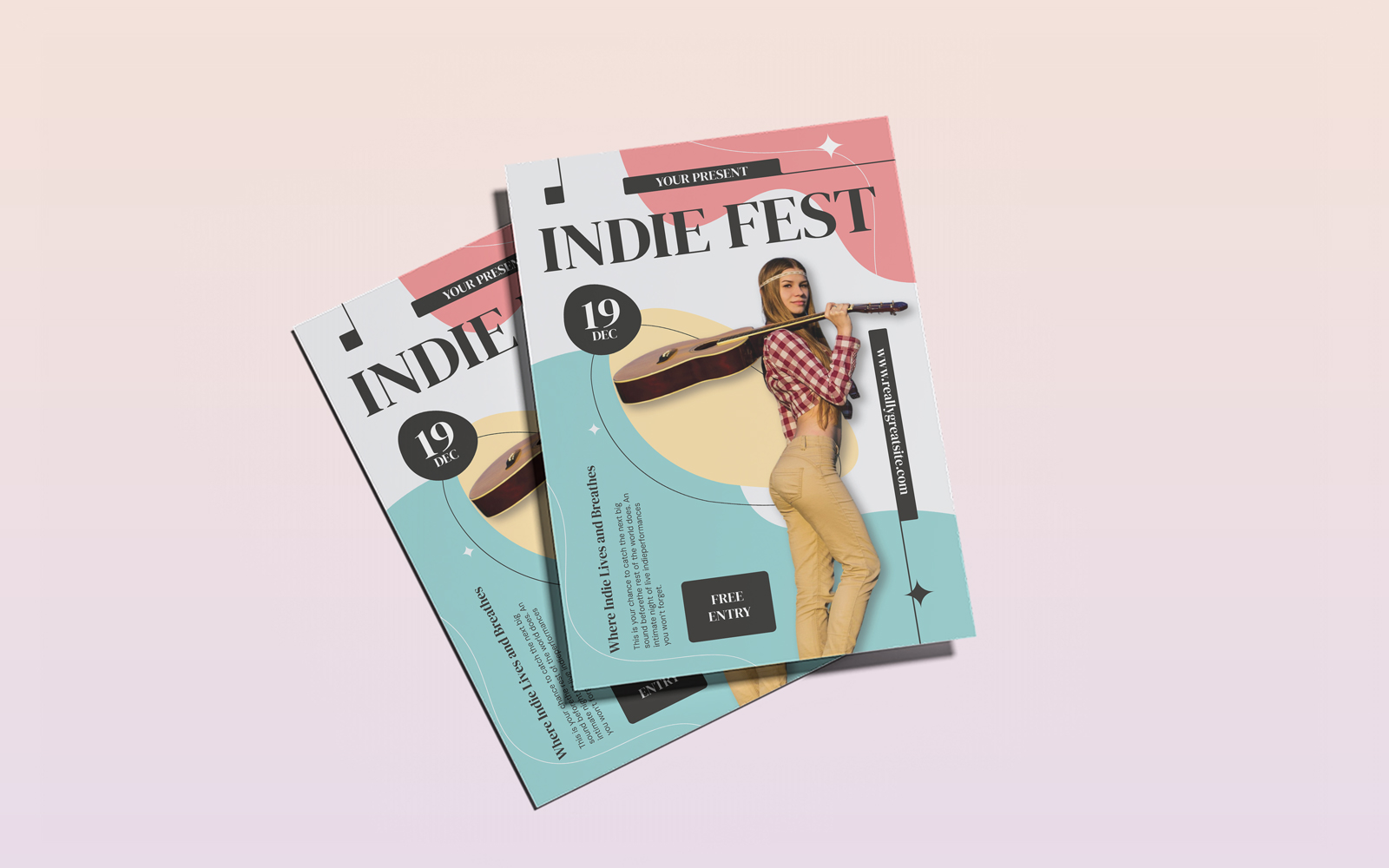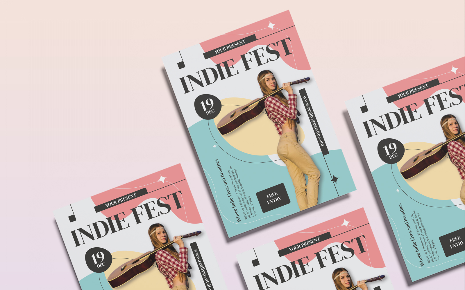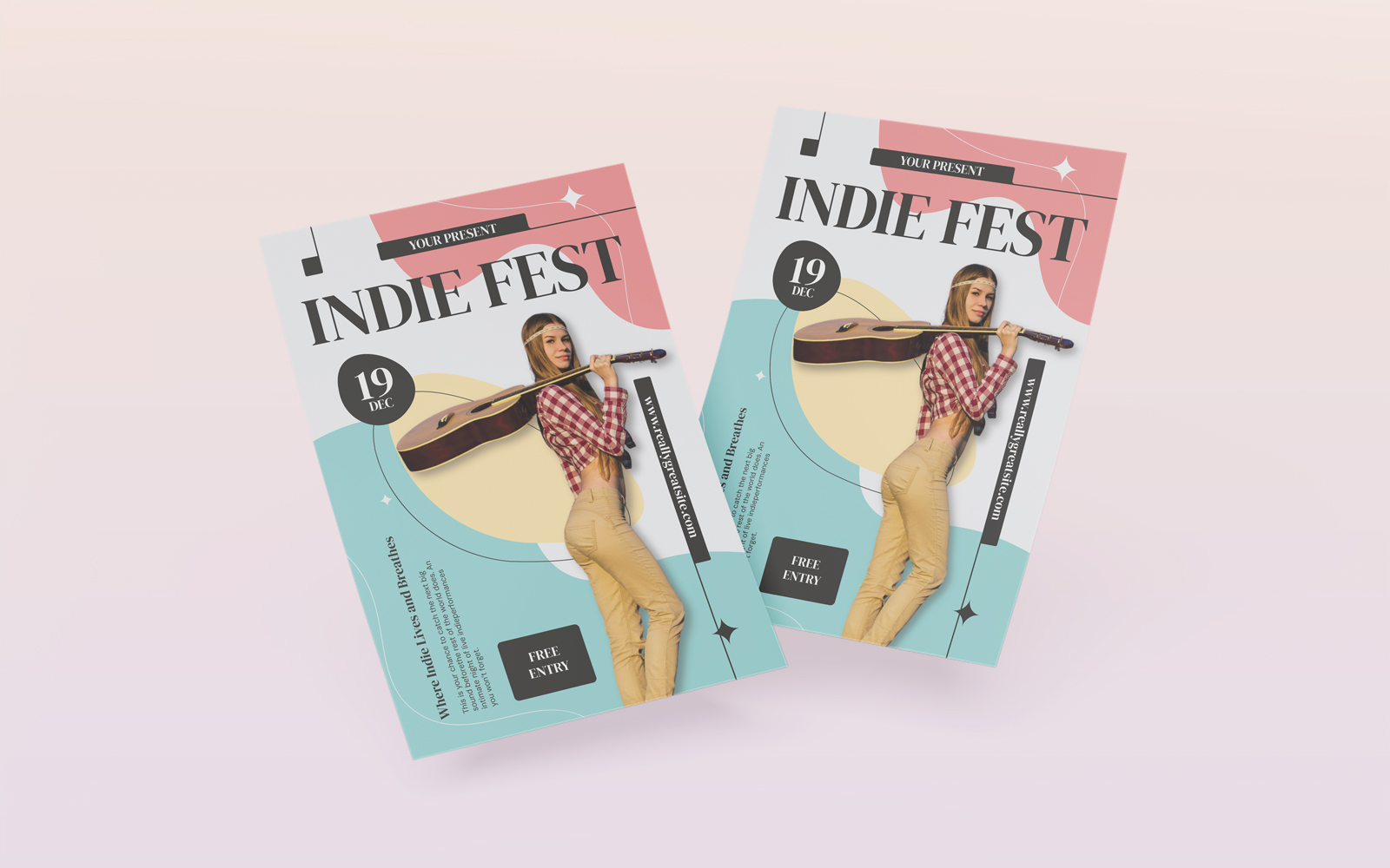 Capture the spirit of modern indie culture with the Indie Fest music flyer template. Designed with bold typography, abstract shapes, and a free-spirited female musician aesthetic, this editable flyer is perfect for acoustic nights, music festivals, and live performances. Ideal for bands, event planners, and creative studios looking for a vibrant, bohemian-style poster to elevate their promotional visuals.