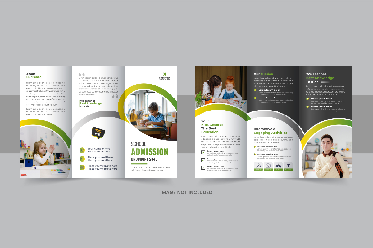 Kids School Admission Trifold Brochure, International school trifold brochure template design. All type of Corporate business company, agricultural Company, Home Sale, Land Sale or other property selling company could use this Kids School Admission Trifold Brochure, International school trifold brochure template design