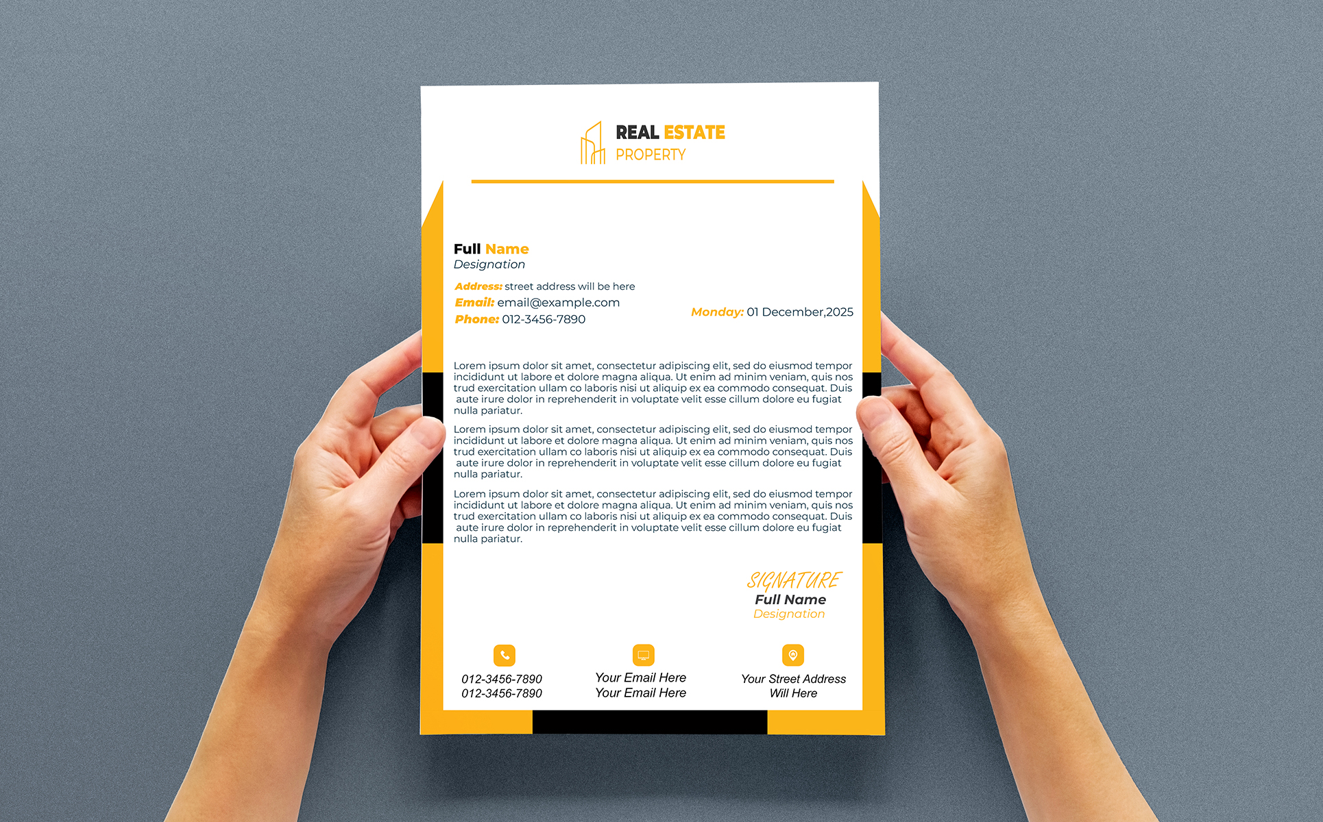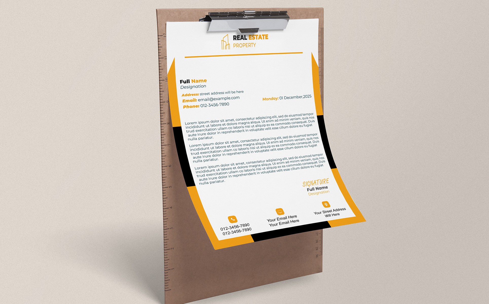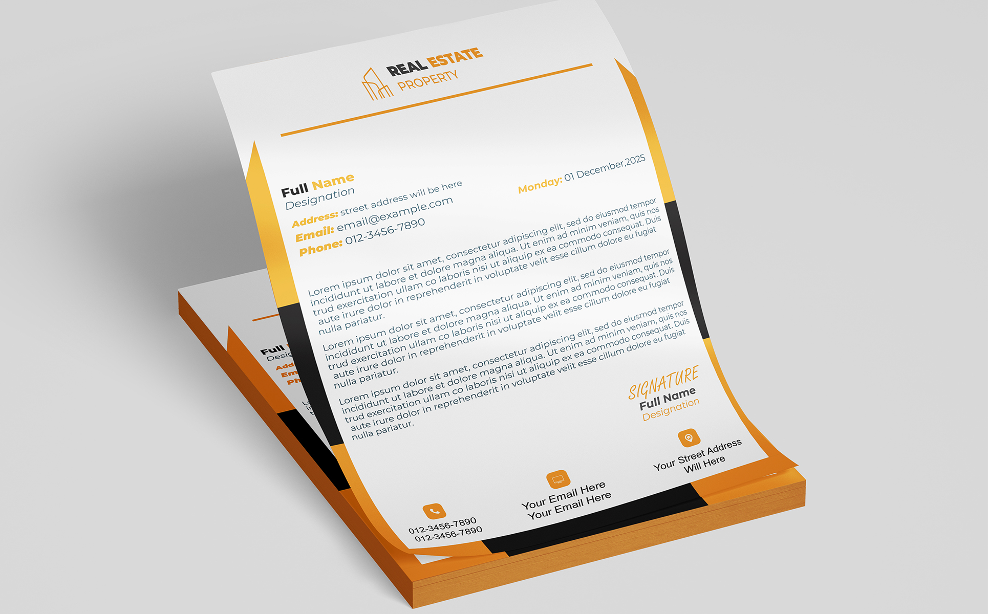 Bold, creative, and well-structured – this letterhead is ideal for design agencies and startups. The vibrant layout draws attention while maintaining professionalism. Fully layered and print-ready PSD for quick edits.