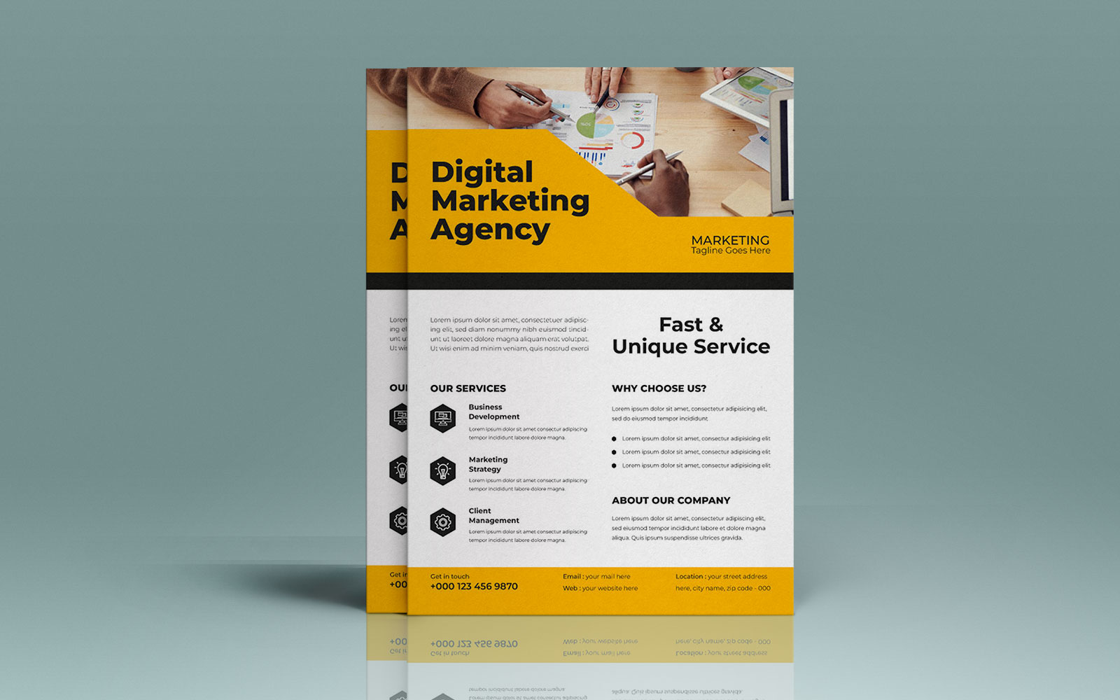 This is a Digital Marketing Agency Corporate Business Flyer Design. It is a Flyer Template that is suitable for promoting your Business. Most of the design is based on the shape, so you can scale it to any size. Easy to edit, then It is print-ready!