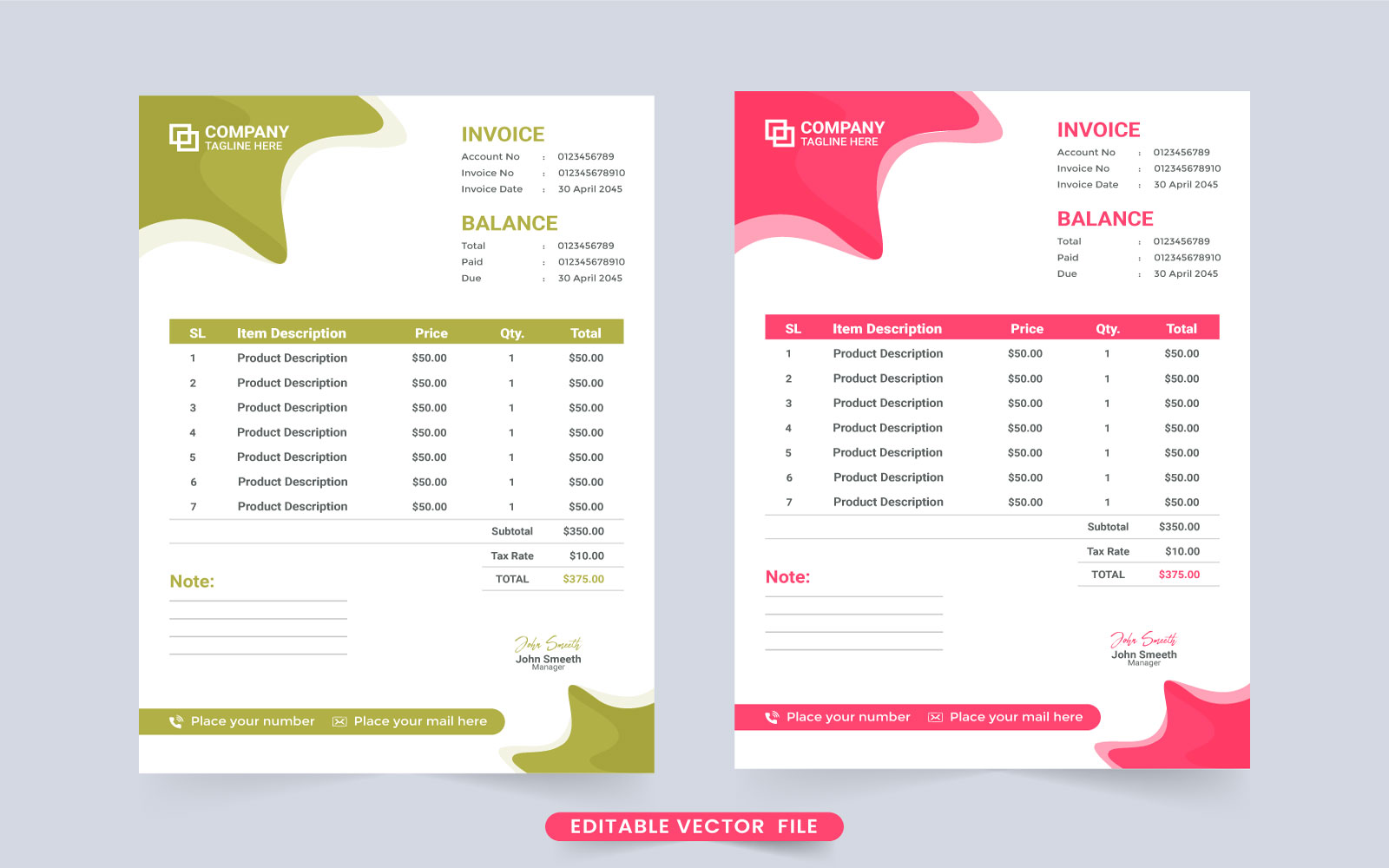 Minimal invoice receipt decoration. Minimalist purchase receipt and invoice template vector for business. Payment receipt template with abstract shapes. Payment agreement and invoice bill template decoration with green and red colors.
