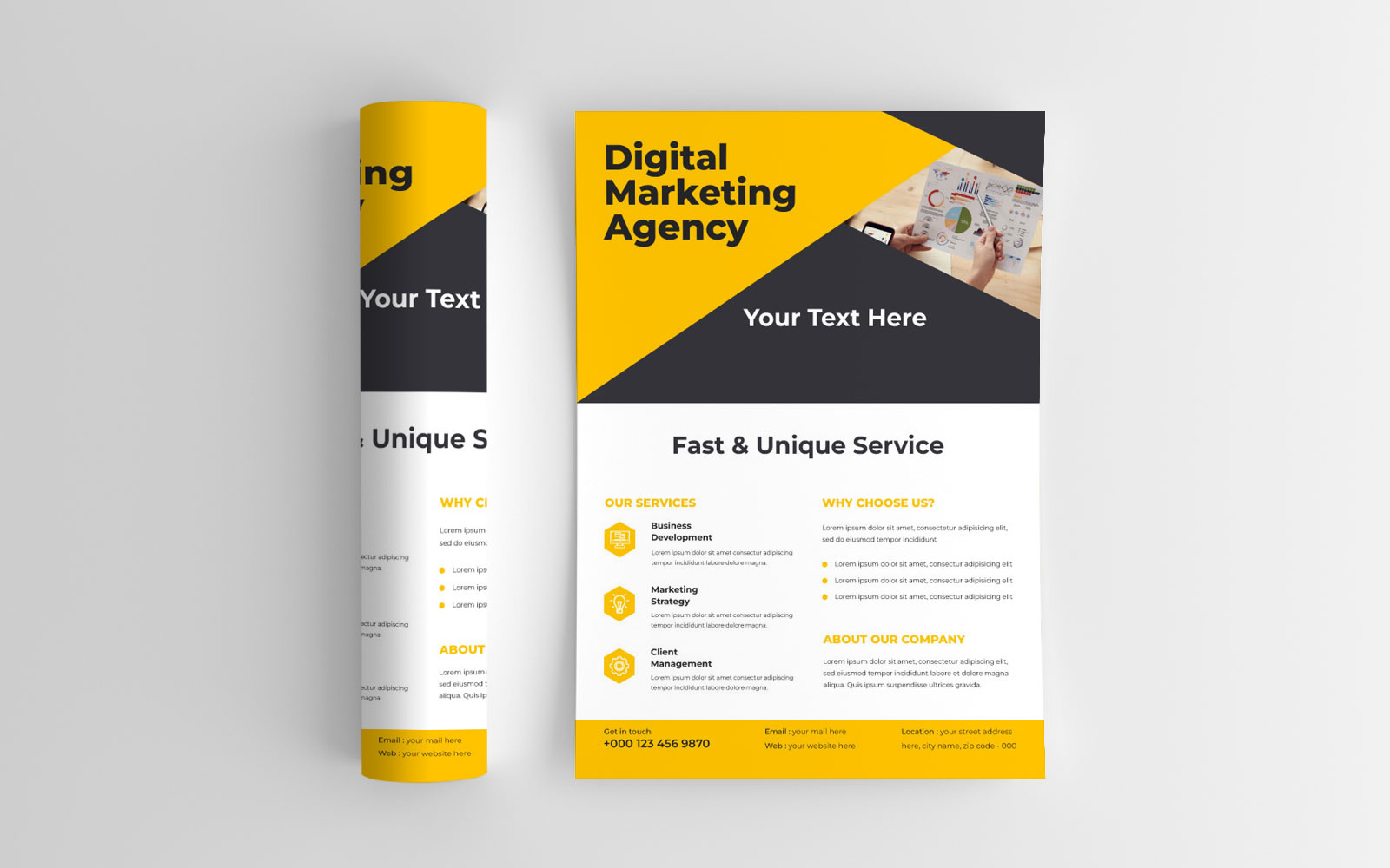 This is a Digital Marketing Agency Corporate Business Flyer Design. It is a Flyer Template that is suitable for promoting your Business. Most of the design is based on the shape, so you can scale it to any size. Easy to edit, then It is print-ready!
