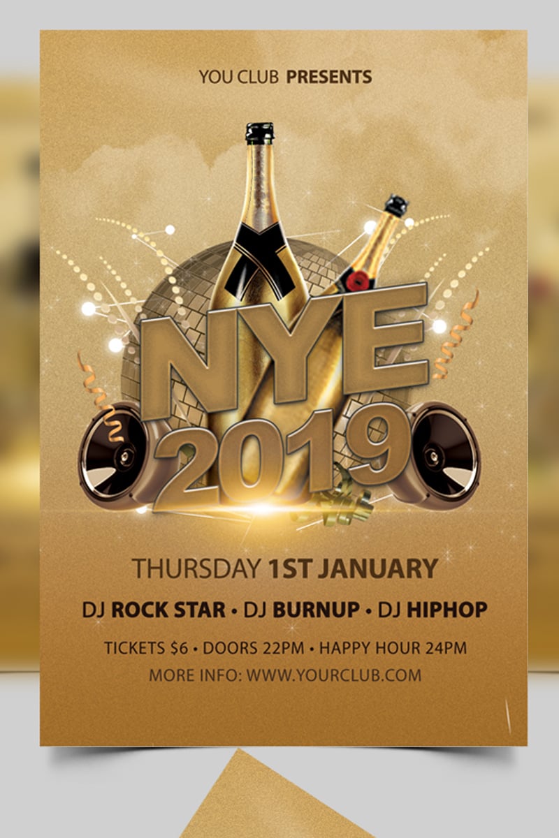New Year Party Flyer Design PSD. This Party Flyer Design PSD for New Year Parties and New Year celebration or any type of seasonal party events. It is suitable for any kind of bar, cafe, lounge advertising purposes. This Flyer PSD Template download contains 300 dpi, print-ready, CMYK PSD file. All main elements are editable and customizable, you can change background color using Adobe Photoshop according your event and party theme.