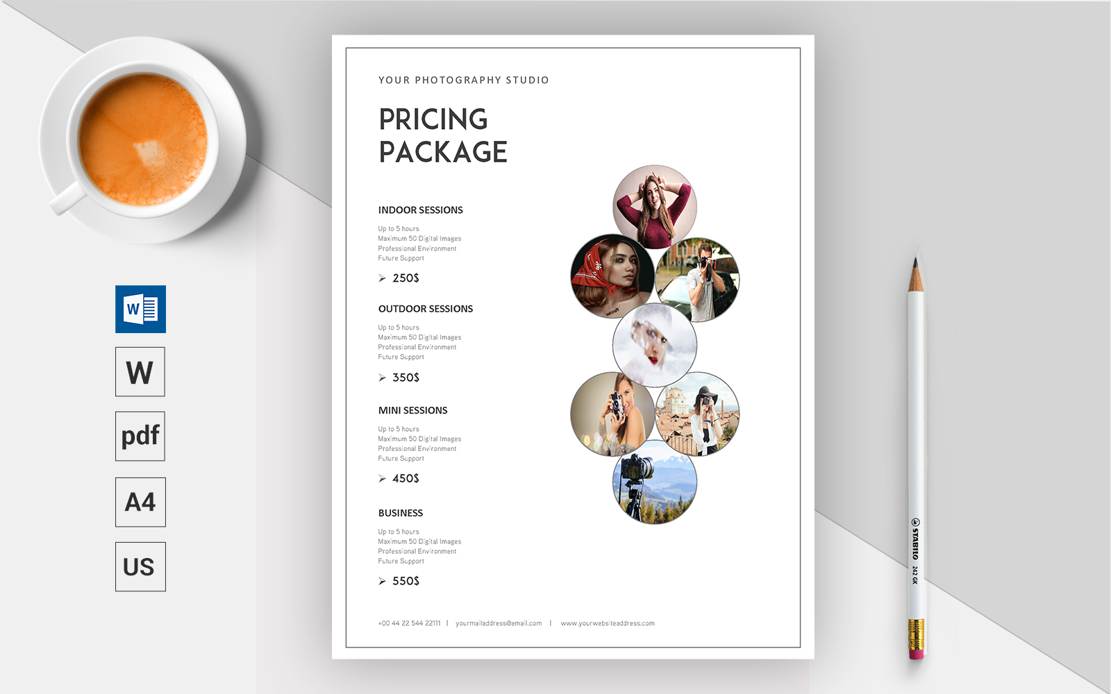 It is a pricing guide for your photo session. You can use it for any photography business such as weeding, lifestyle portrait, etc. Easy to share using email or print it and show to your potential clients. Available in Microsoft Word (.docx Format). Easy to customize text, change text color, and input your own images! :)