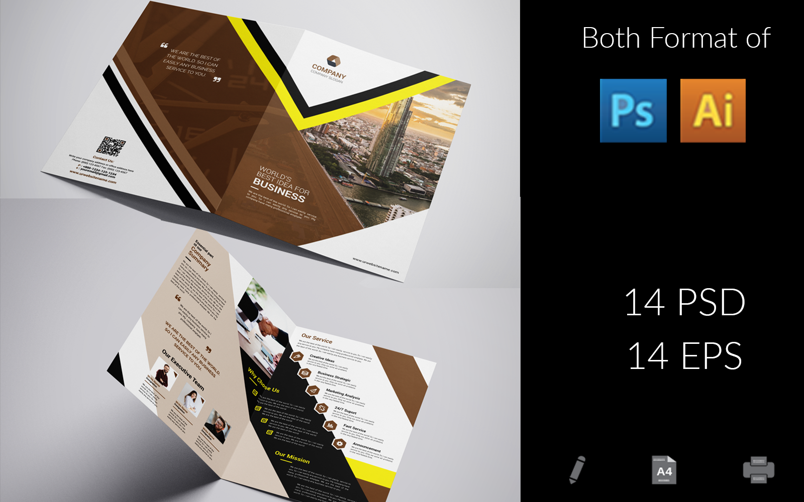 This Bi-fold is brochure available for use at all business establishments. This is specially useful for corporate businesses. This design was created by 2 software. The original file has 14 EPS & 14 PSD templates and one support file. Swatch color is used in EPS template. PSD template created by Shape Layer. The rules for changing the template are provided in the Support File in the form of a manual. This File open is programs (cs3, cs4, cs5, cs5.5, cs6, cc, cc+), it's item minimum adobe cs3 open and any update program version opening.