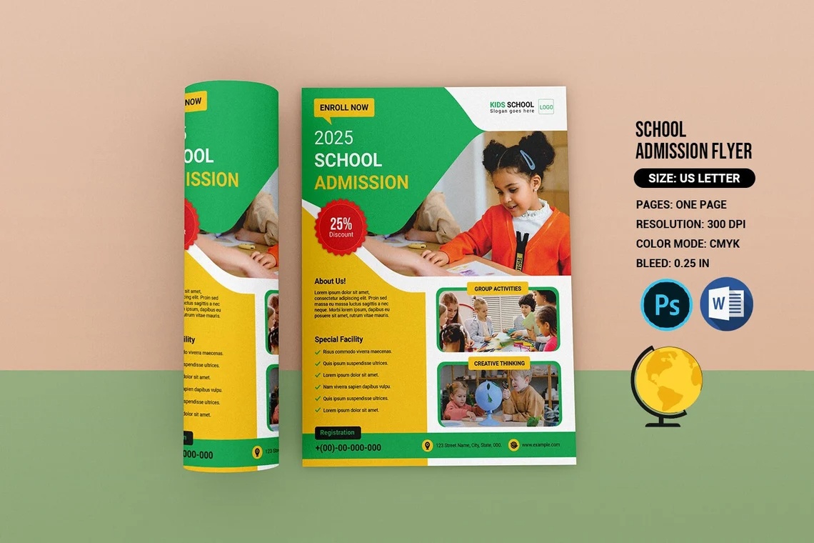 School Admission Flyer template School flyer template is suitable school and any educational organization. Smart object used to replace images and all object is in separate layer for easy edit ability.