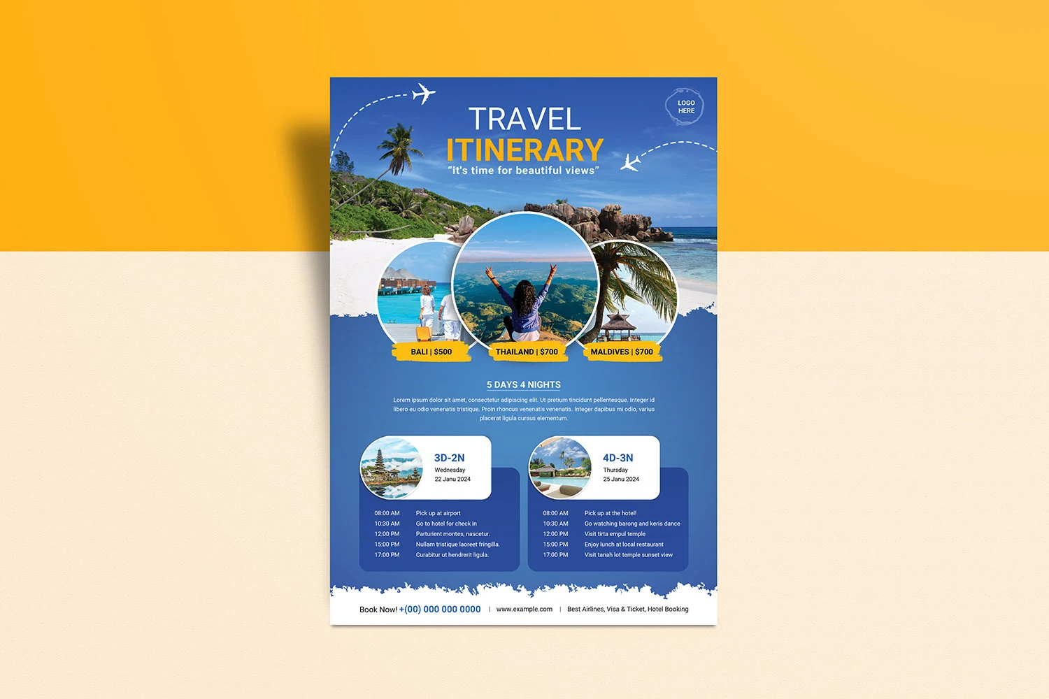 Stylish travel itinerary flyer template designed for tour packages, vacation planning, and travel agency promotions. Perfect for showcasing destinations and trip details.