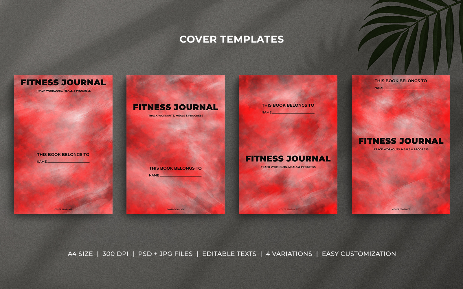This red watercolor fitness journal cover set features a clean, minimal design ideal for wellness-focused creators. Designed for fitness professionals, lifestyle coaches, and designers, these editable templates are perfect for gym journals, workout planners, diet logs, or wellness diaries. The A4-sized designs are easy to edit in Photoshop, with organized layers and editable text fields. Print-ready and high resolution, each template also includes a helpful instructions PDF to guide customization. Perfect for both digital and print use.