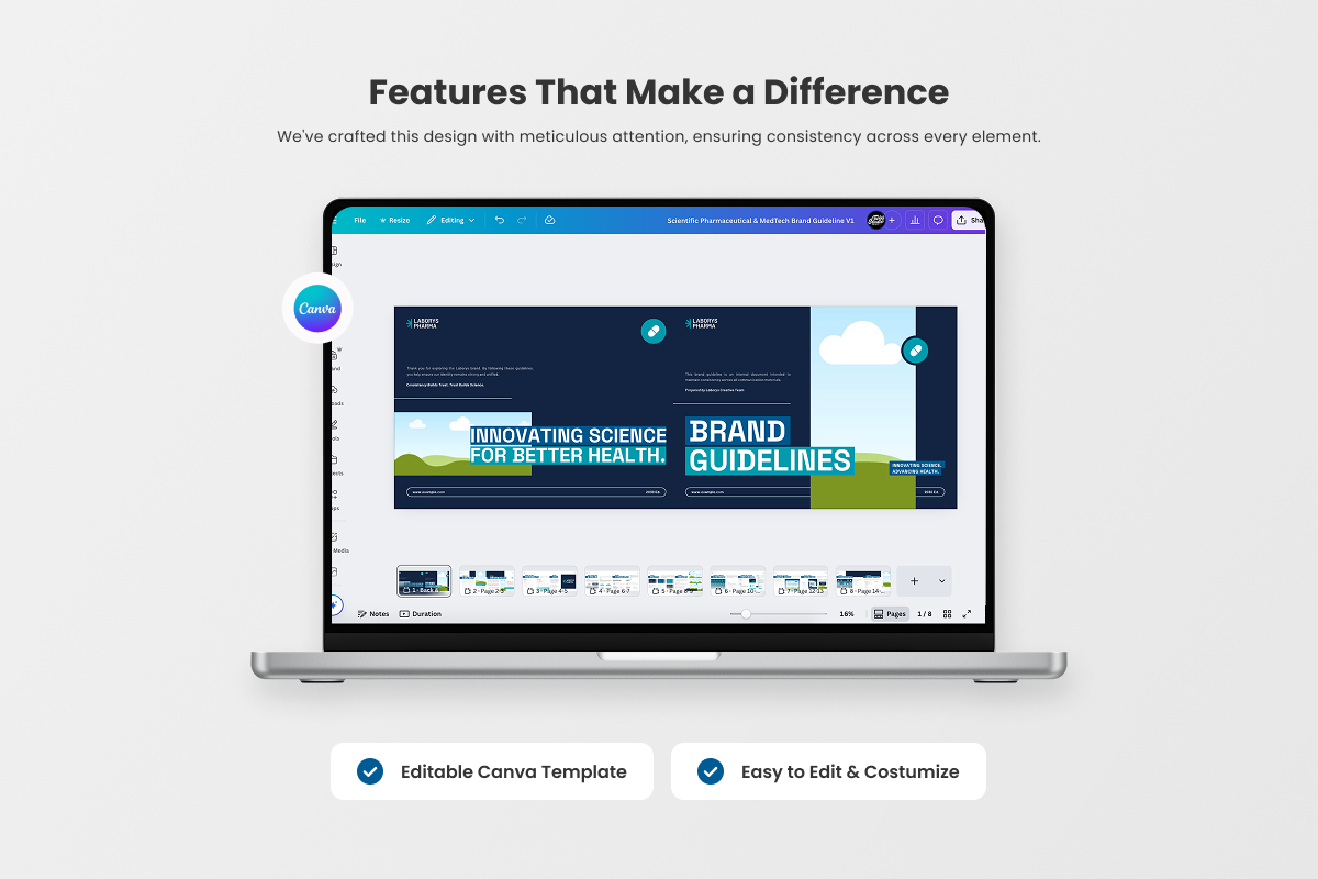 Perfect for biotech startups, pharmaceutical companies, and medical technology innovators who need a professional, data-driven brand document. This template helps you establish a consistent visual language across every touchpoint, making your brand feel credible, innovative, and future-ready.