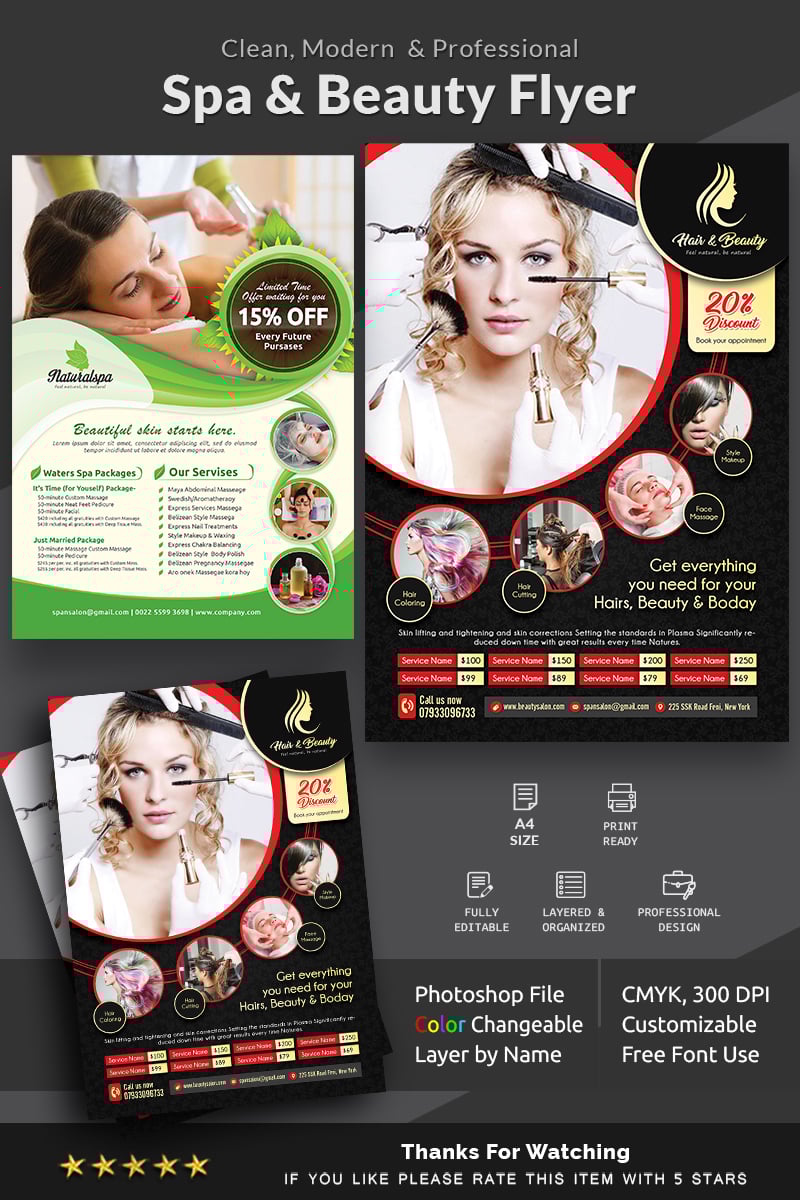 This Spa, Hair & Beauty Flyer Template is perfectly suitable for promoting your Business. You can also use this template in multipurpose advertising purpose. This Template is well organized and structured. Images, texts and colors are fully editable. You can edit them quick and easy. All PSD are very well organized proper Layer by name & groups. Image placeholders are Smart-Objects to make easy for you to add image And edit file.