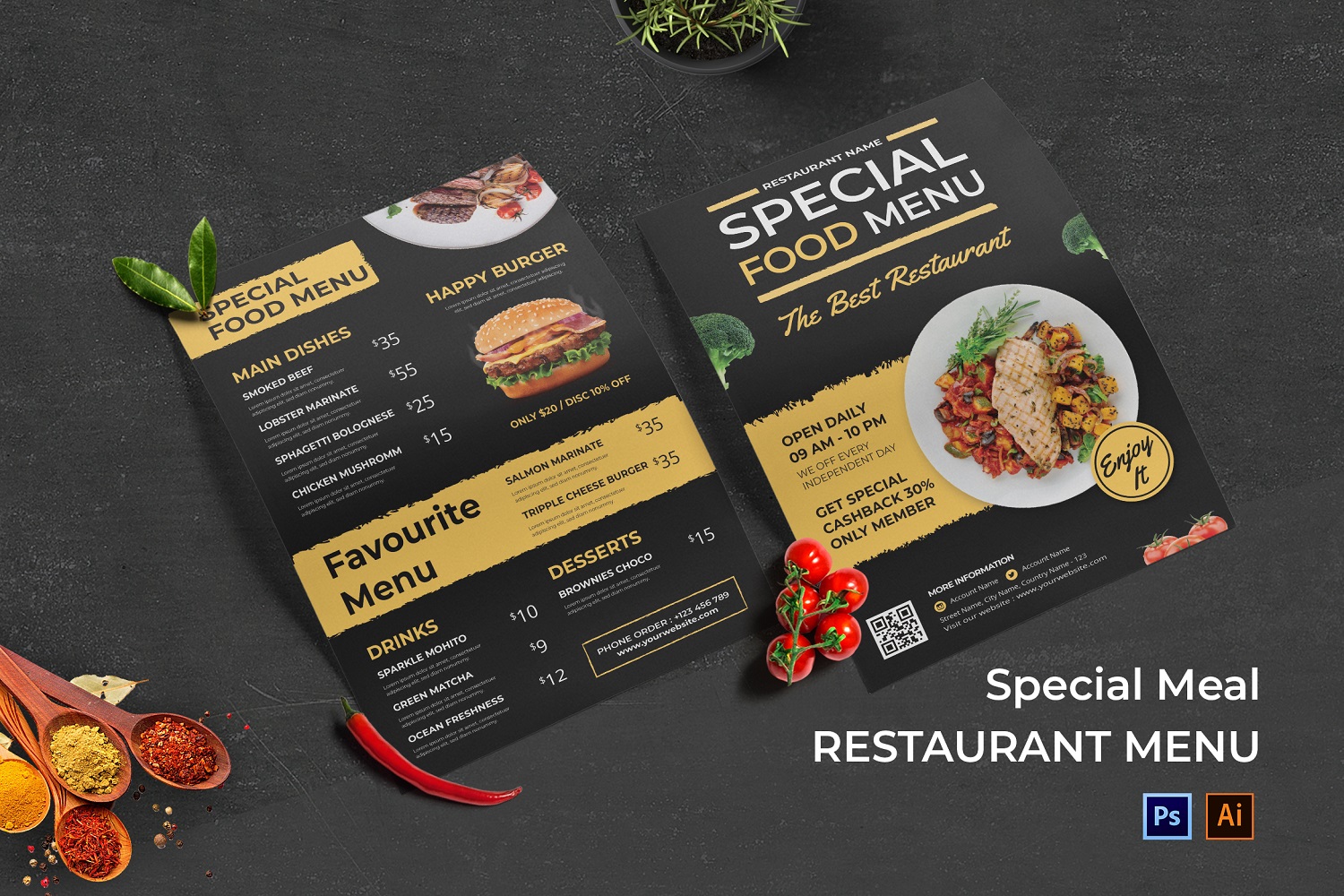 This Food Menu Set template has fully editable and customizable PSD and AI files. This Food Menu template also has creative style, and it's suitable for your any purpose such as: businesses, corporate, agency and can be also used for any other publishing like marketing promotions and company profile.