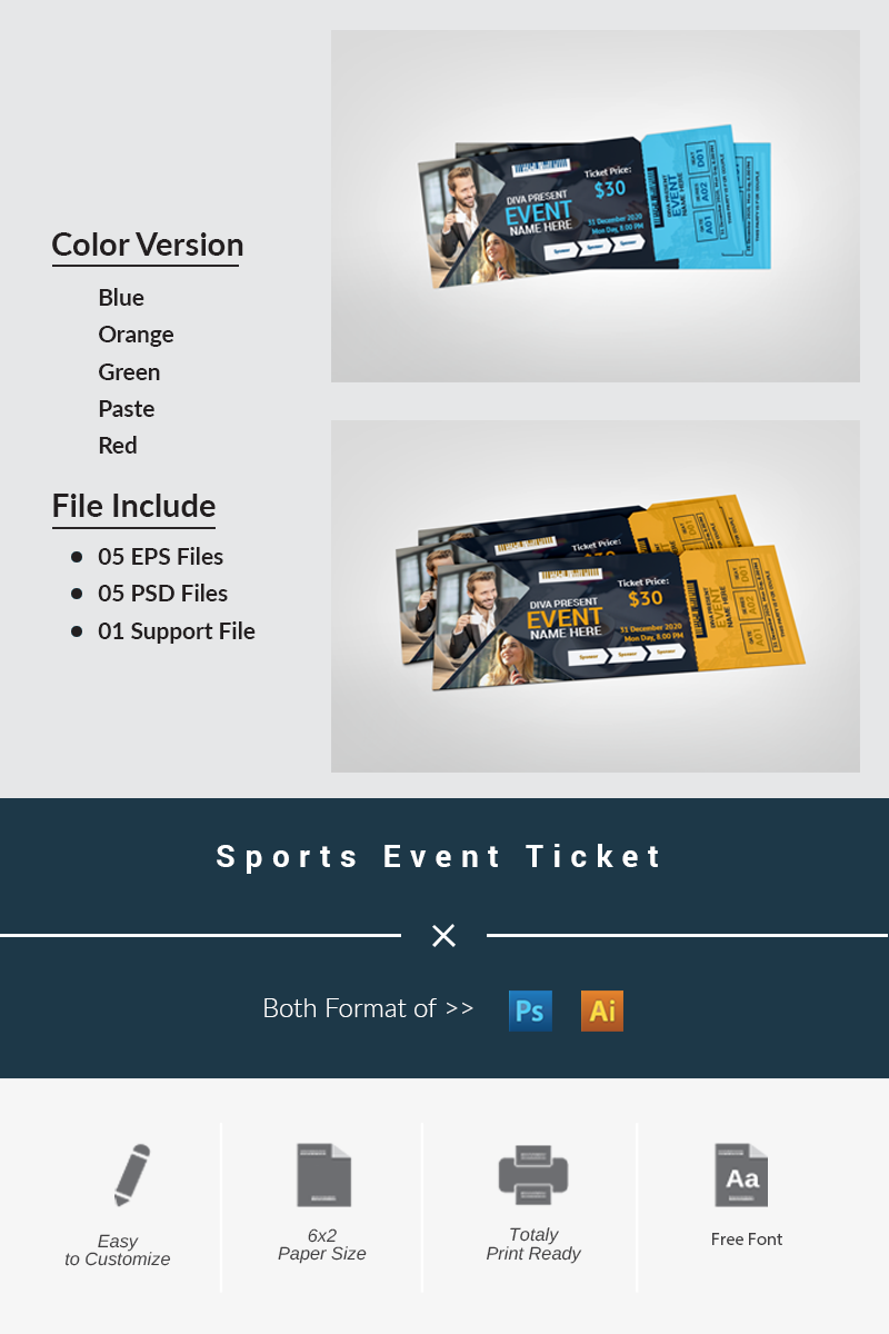 This event ticket can be used in all cases. It was created by two software (Adobe Illustrator CS3, Adobe Photoshop CS3). This File open is programs (cs3, cs4, cs5, cs5.5, cs6, cc, cc+), it's item minimum adobe cs3 open and any update program version opening. The original file contains 10 templates and one support file. The rules for changing the templates are provided in the Support File manual. Shape layer is used in PSD template and Swatch color is used in EPS template.