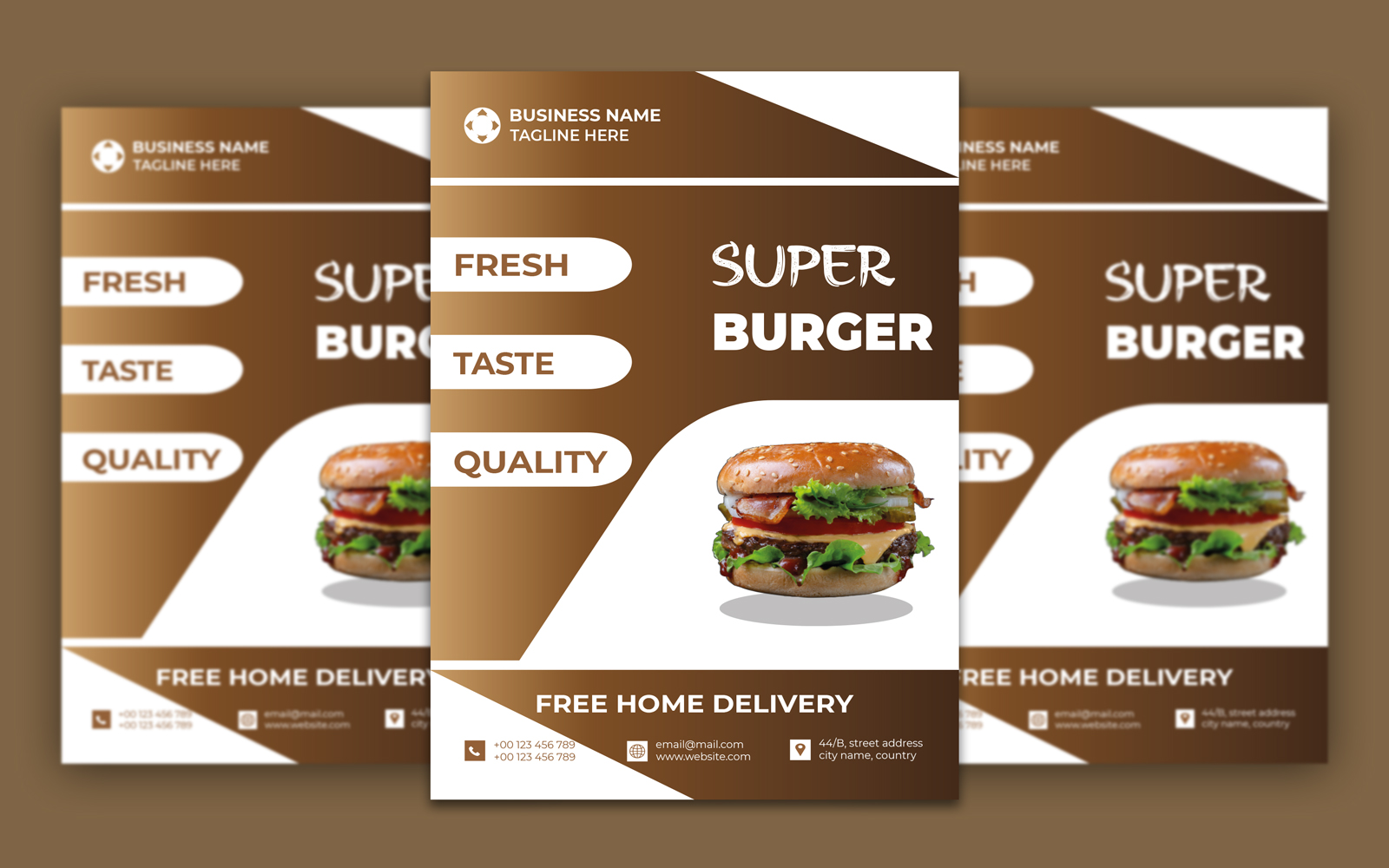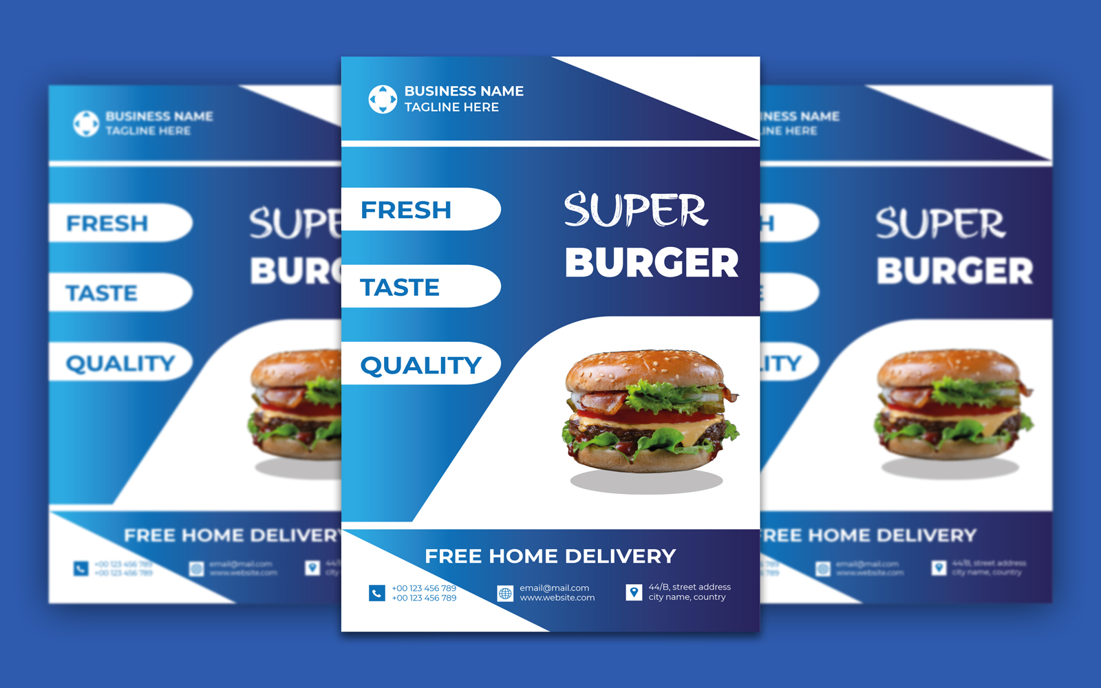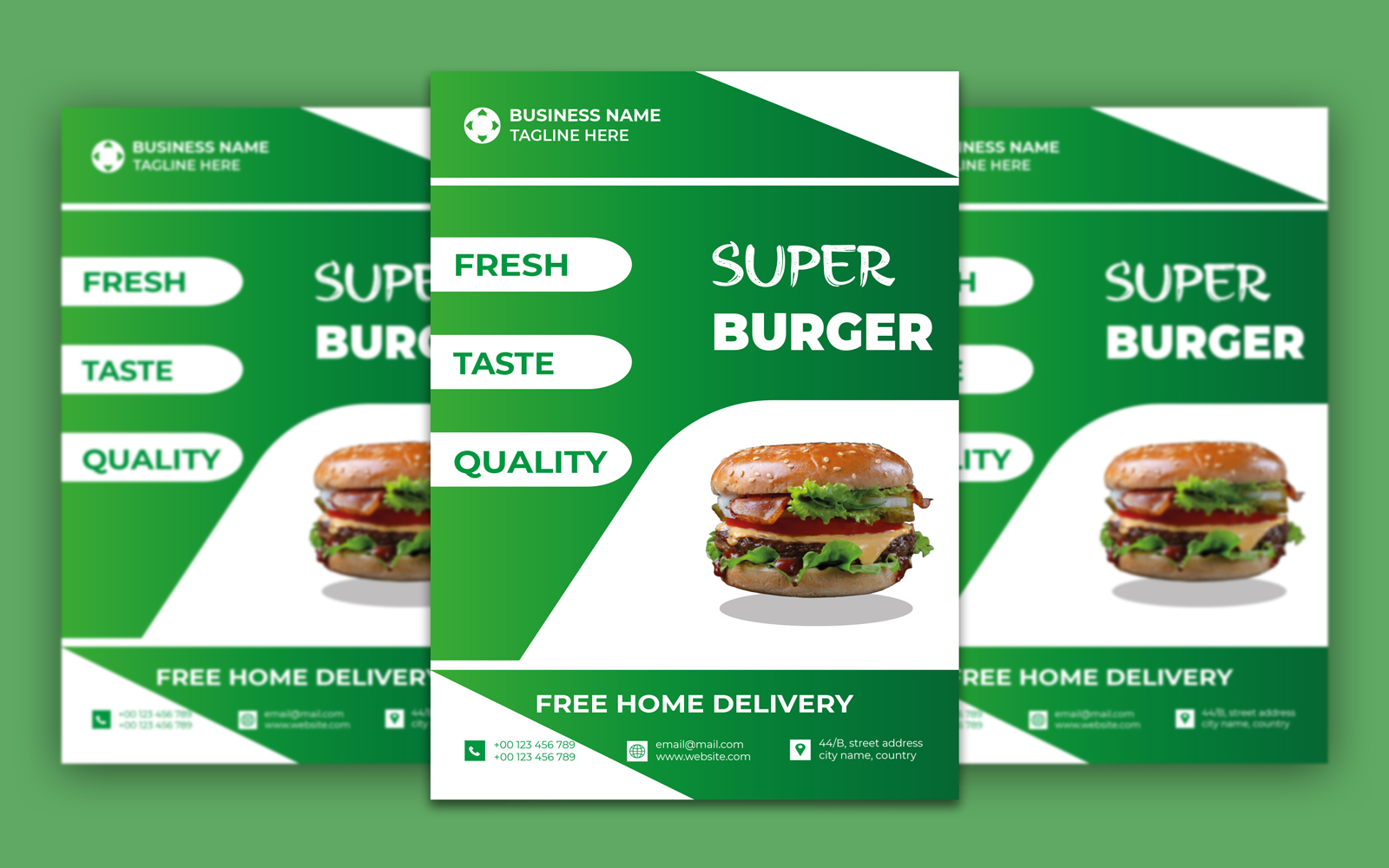 It's a Burger Flyer with four colour variations. The flyer is very useful for burgers, fast food, bakery and food business. The flyer is vector-based built-in Illustrator software that is fully editable and scalable without losing resolution.