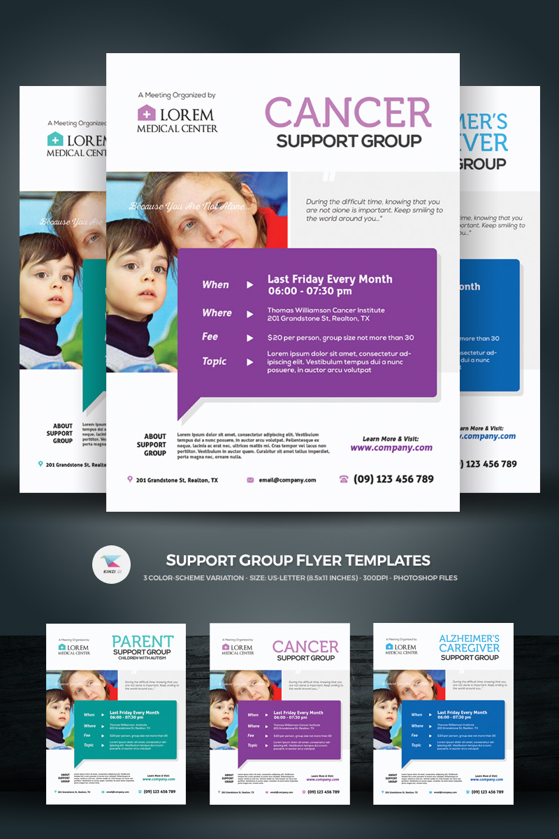 A flyer template pack ideal for advertising a support group event. Available in 3 color-scheme variation, the templates are fully editable (you can change the sample texts, place new photo on the photo placeholders or change the color scheme of the design)
