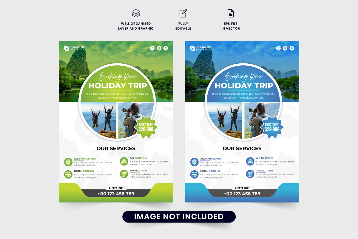 Vacation planner flyer template vector. Holiday trip planner agency advertisement flyer vector with photo placeholders. Vacation planner business promotional leaflet and poster vector. Tour and travel flyer design with green and blue colors