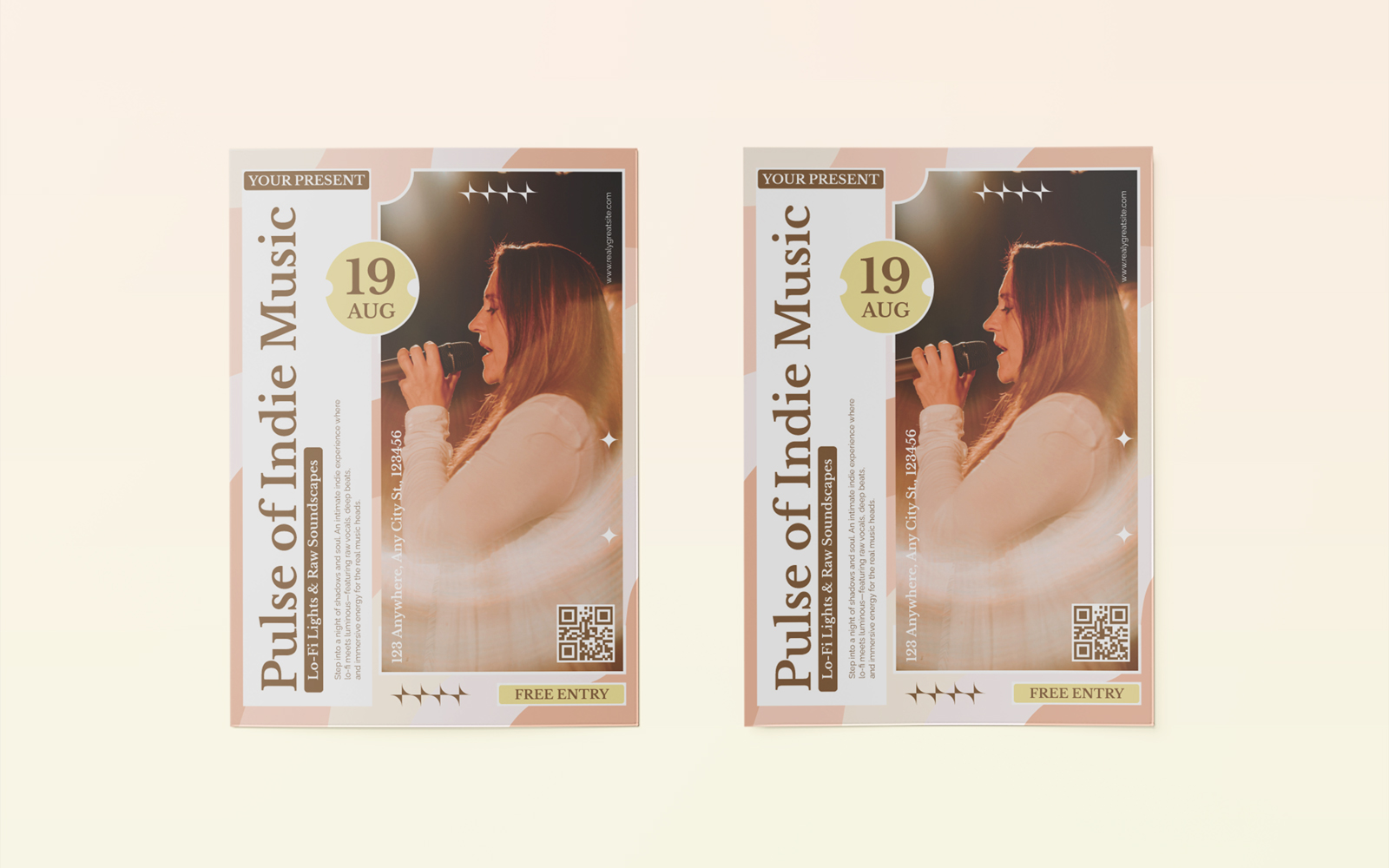 A warm and retro-inspired flyer design perfect for lo-fi indie events, cozy jam nights, or soulful live performances. This template uses beige and earthy tones to create a nostalgic yet professional vibe. Ideal for underground music promos, open mic nights, and mellow acoustic gigs.