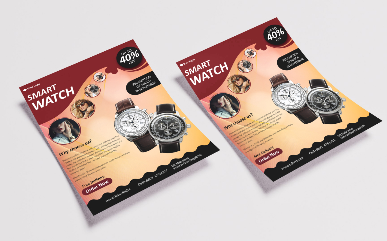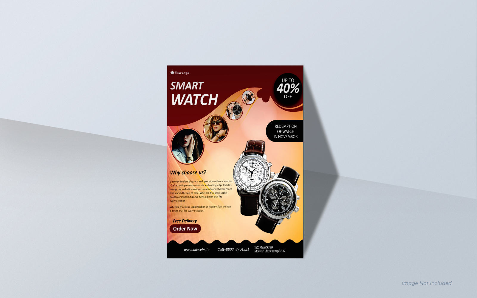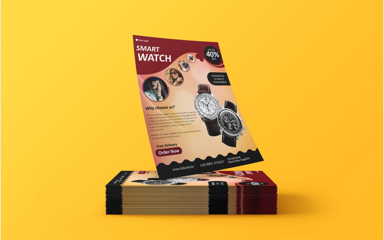 A luxury watch flyer designed to captivate timepiece enthusiasts and collectors alike. The flyer showcases the watch's sophisticated design, precision craftsmanship, and premium materials, emphasizing the elegance and timeless appeal of the piece. High-quality images highlight key details like the intricate dial, durable band, and advanced features.