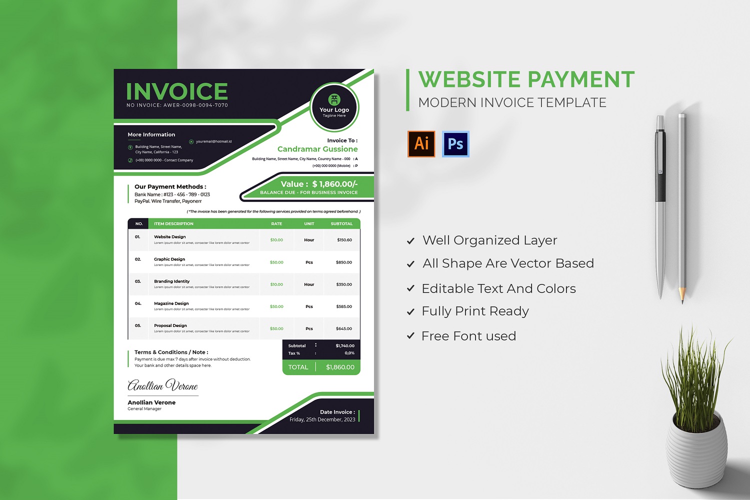 This Invoice template has fully editable and customizable PSD and AI files. This Invoice template also has creative style, and it's suitable for your any purpose such as: businesses, corporate, agency and can be also used for any other publishing like marketing promotions and company profile.