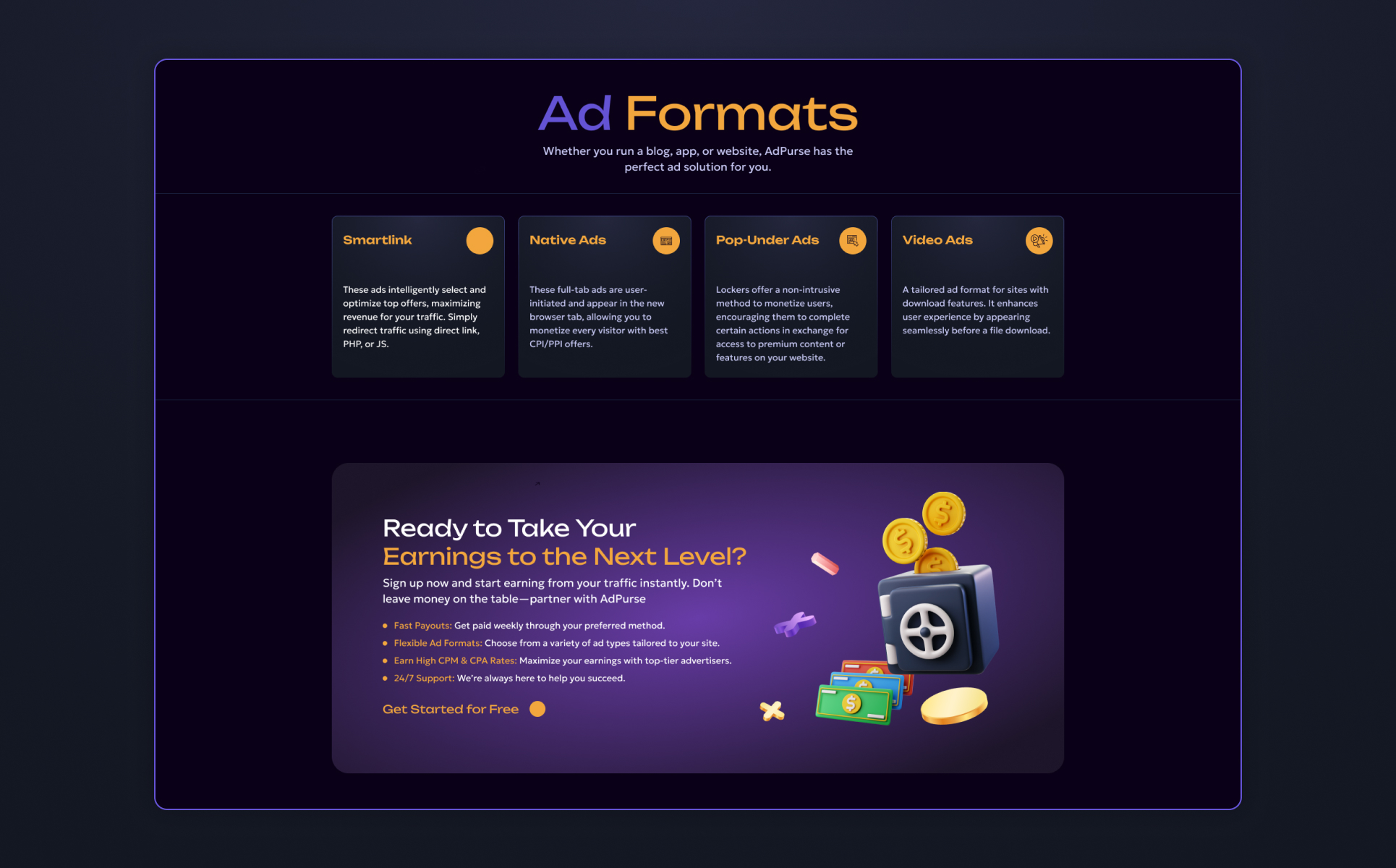 Designed for ease of use and profitability, AdPurse is the ultimate solution for launching or optimizing your monetized website faster. Whether promoting digital products, affiliate links, or sponsored content, AdPurse helps you scale confidently.