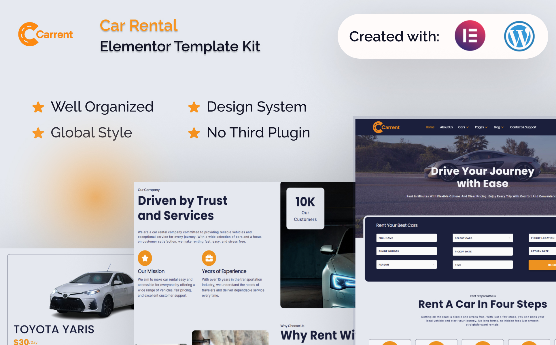 Introducing "Carrent" Carrent is a sleek and modern Car Rental Template Kit designed specifically for WordPress and built with the power of Elementor, making website creation fast, flexible, and fully customizable without writing a single line of code. Leveraging Elementor’s intuitive drag-and-drop interface and WordPress’s powerful CMS capabilities, Carrent empowers car rental businesses to launch professional websites in no time. Whether you're running a vehicle hire service, rent-a-car agency, car booking platform, or automotive leasing company, this template kit is tailored to meet your needs. Featuring clean layouts, service showcase sections, fleet listings, pricing plans, booking forms, and responsive design, Carrent ensures your business looks polished and accessible on all devices. Perfect for car hire businesses looking to boost their online presence, streamline reservations, and stand out in a competitive automotive rental market.