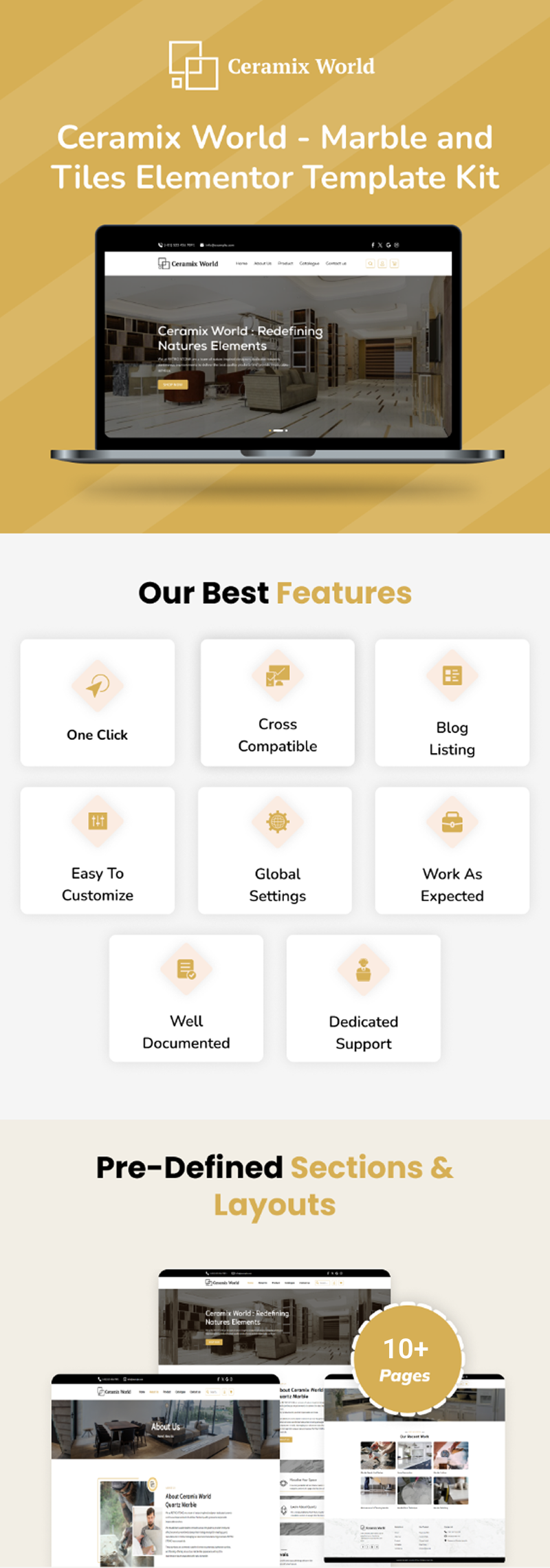 Ceramix World - Marble and Tiles E-commerce Elementor Template Kit is crafted specifically for the marble and tile industry. With its clean, modern design, the template offers an intuitive user interface perfect for showcasing products and services. Fully responsive and user-friendly, it ensures a seamless experience across all devices.