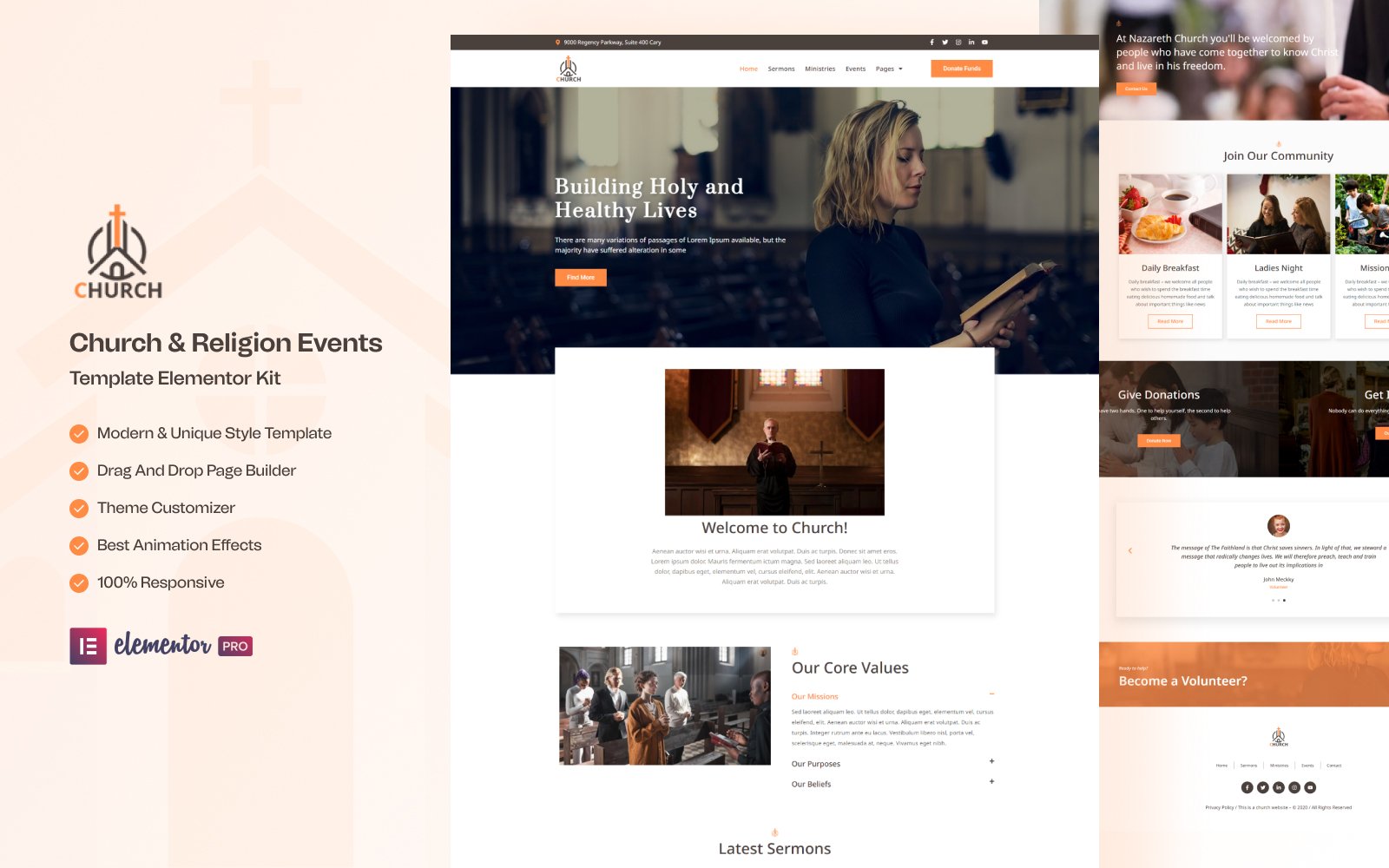 This Elementor kit includes a variety of features that are specifically designed to meet the needs of religious organizations. The kit includes pre-designed pages for "Home," "About Us," "Ministries," "Sermons," "Events," and "Contact Us," making it easy for organizations to quickly create a comprehensive website.