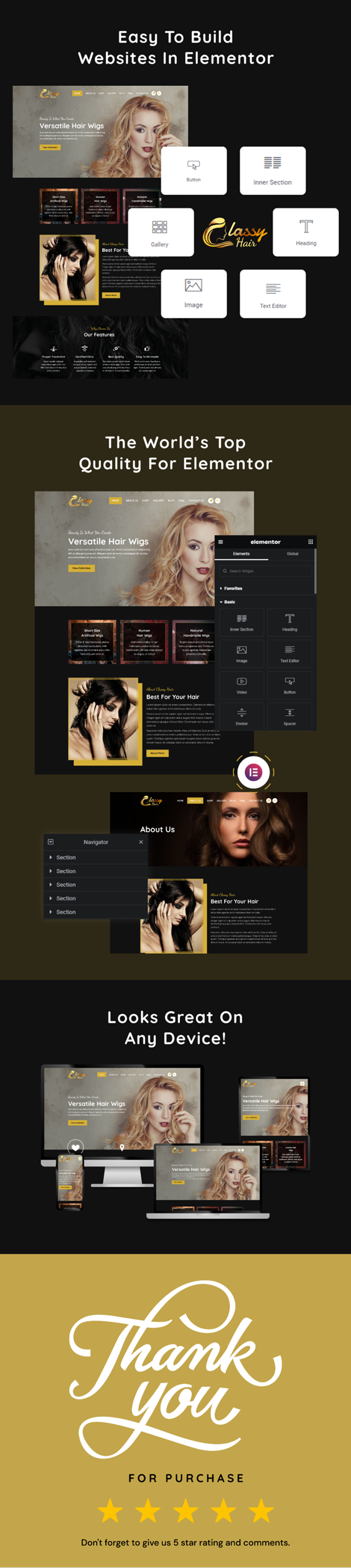 Classy Hair Elementor Kit has a perfectly responsive design with multi-browser compatibility. It has all the fonts and colors globally set up with Elementor Global Settings. You can edit anything with just one click. This kit is built with WordPress well-known plugins Elementor, Elementor Pro, and WooCommerce. So grab this amazing classy Hair kit now and enjoy your coffee.