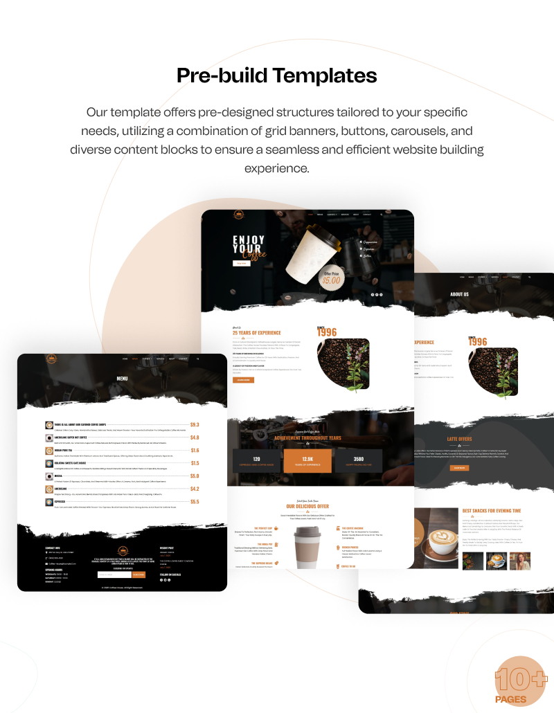 This kit includes over 12 pre-designed templates with clean, professional styling, making it ideal for small cafés, specialty coffee brands, or local roasters. With 9+ page templates, including Home, About, Blog, Contact, and FAQ, Coffee House helps you build an engaging online presence in minutes.