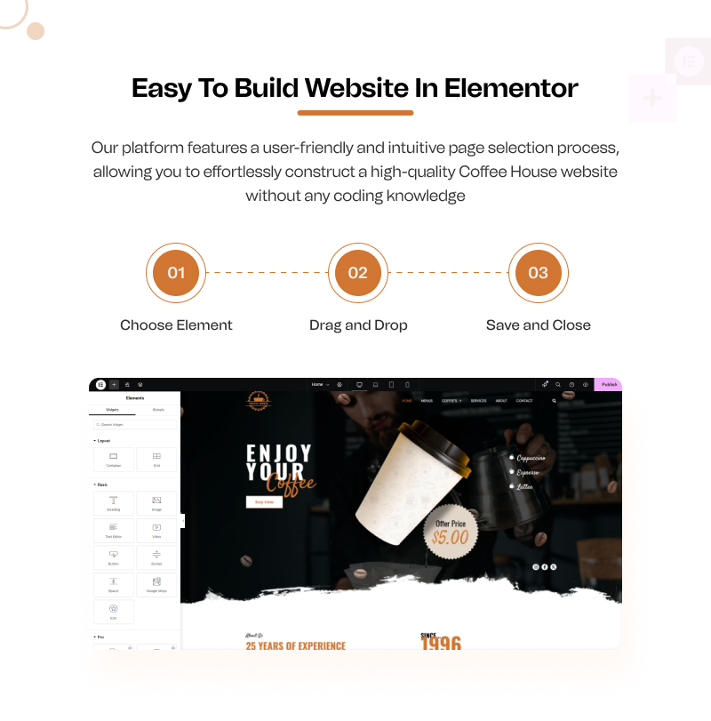 Coffee House is a modern, fully responsive Elementor website kit designed for coffee shops, cafés, and beverage-related businesses. Built with the Elementor page builder for WordPress, this kit makes it easy to create a stylish and functional website — no coding required. You can effortlessly update text, images, and layout to suit your brand.