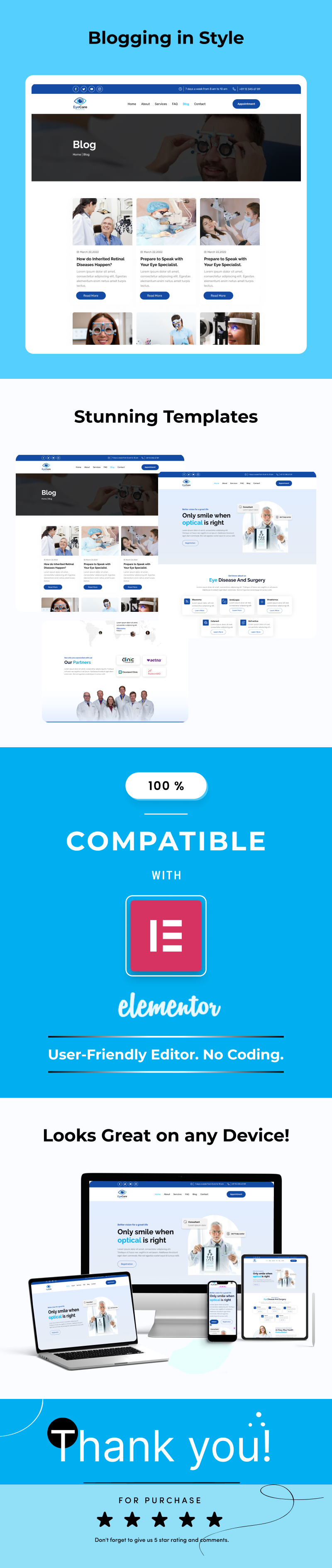 Eyecare - Ocular Care Treatment Website Elementor Template Kit, is an exceptional website template designed specifically for eye clinics and hospitals, Eyecare can be used for Eye clinics, Eye Surgery, Glaucoma surgeries, Refractive Surgery, and Cataract surgery. It has multiple pre-designed beautiful layout templates and Technical code is not required for creating new websites.