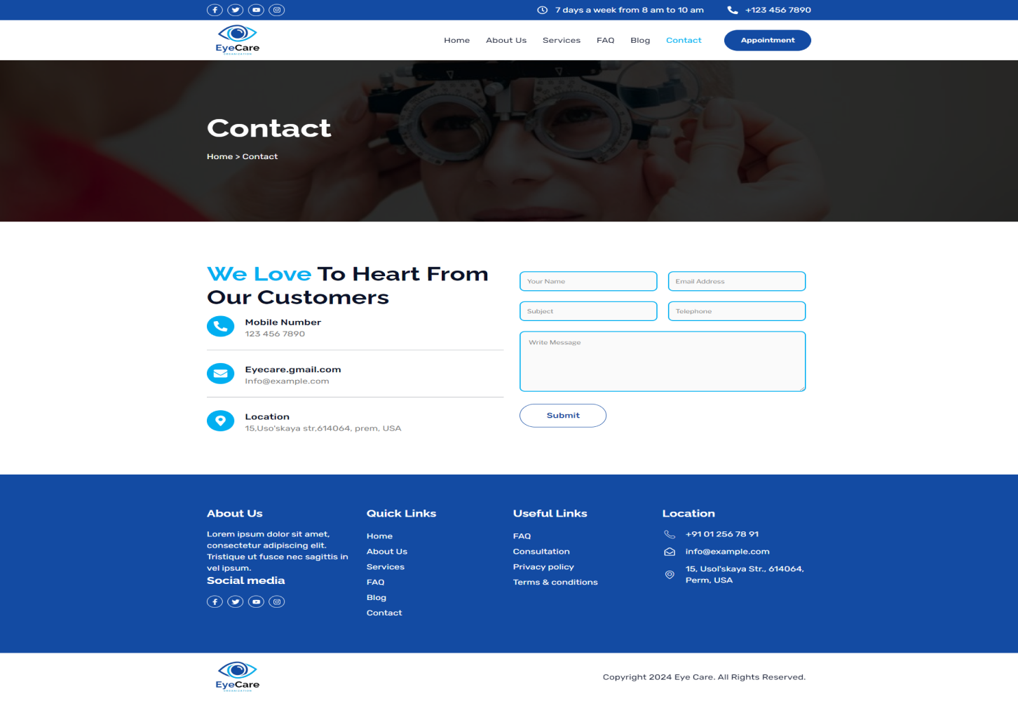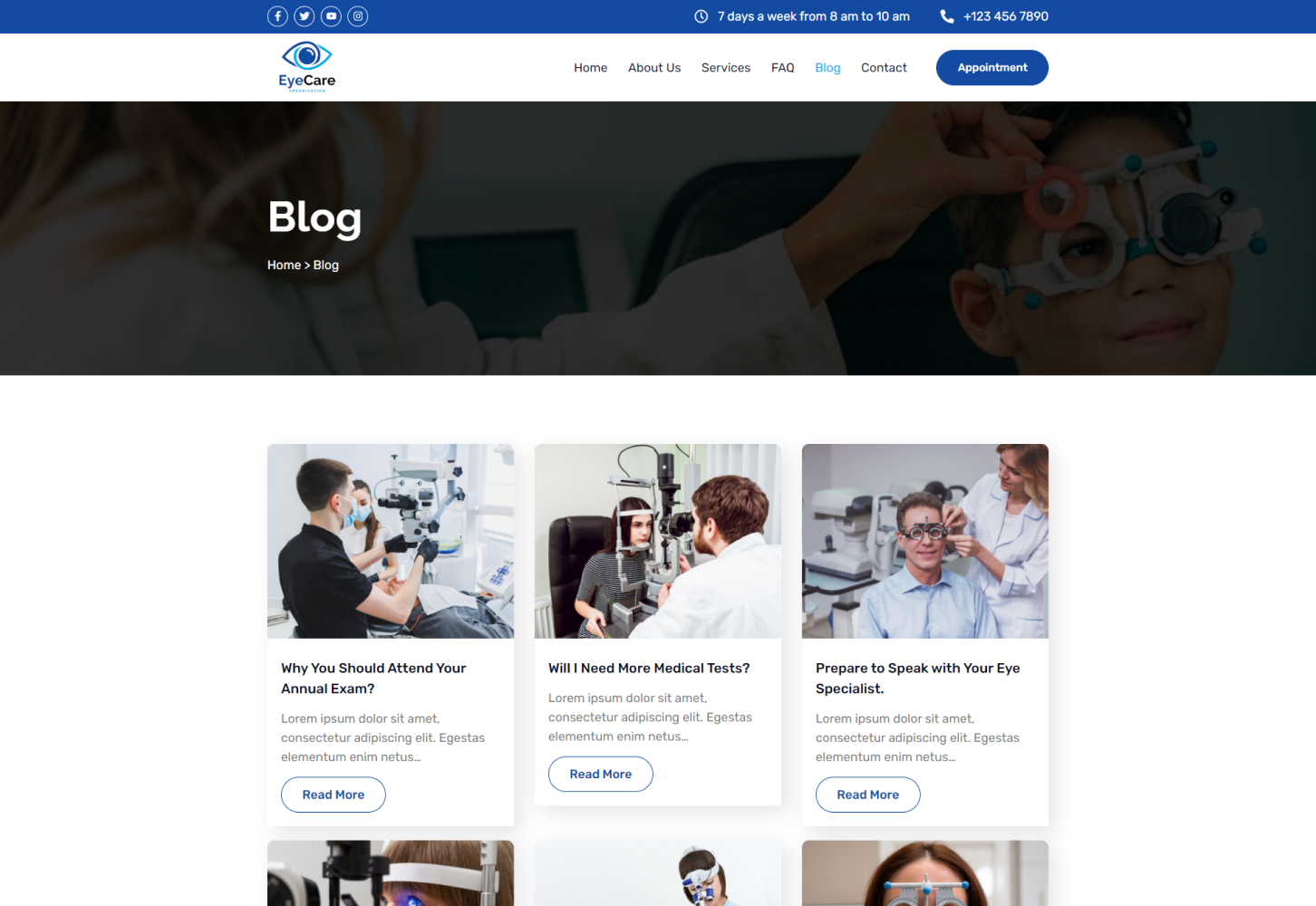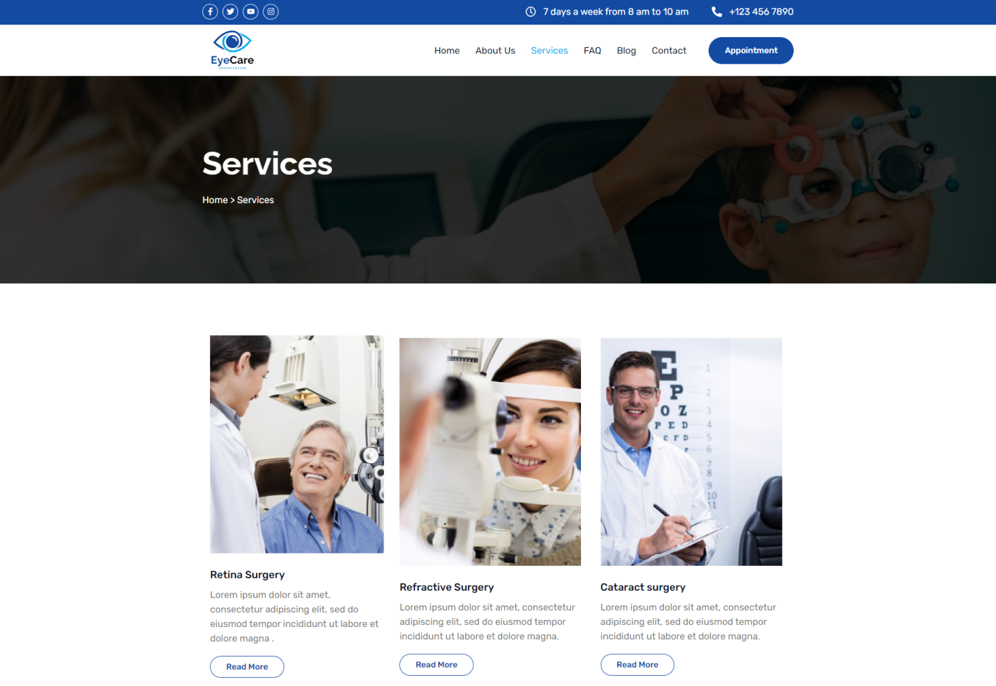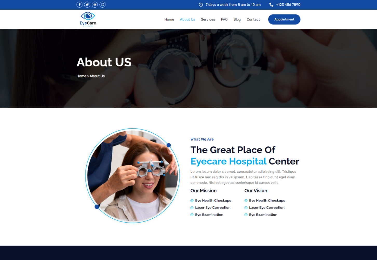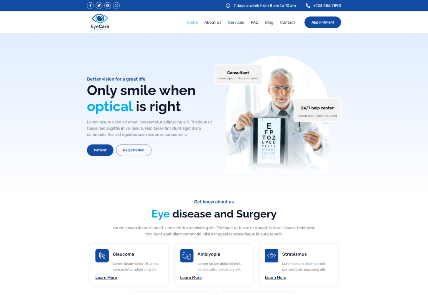 Eyecare - Ocular Care Treatment Website Elementor Template Kit, is an exceptional website template designed specifically for eye clinics and hospitals, Eyecare can be used for Eye clinics, Eye Surgery, Glaucoma surgeries, Refractive Surgery, and Cataract surgery. It has multiple pre-designed beautiful layout templates and Technical code is not required for creating new websites.