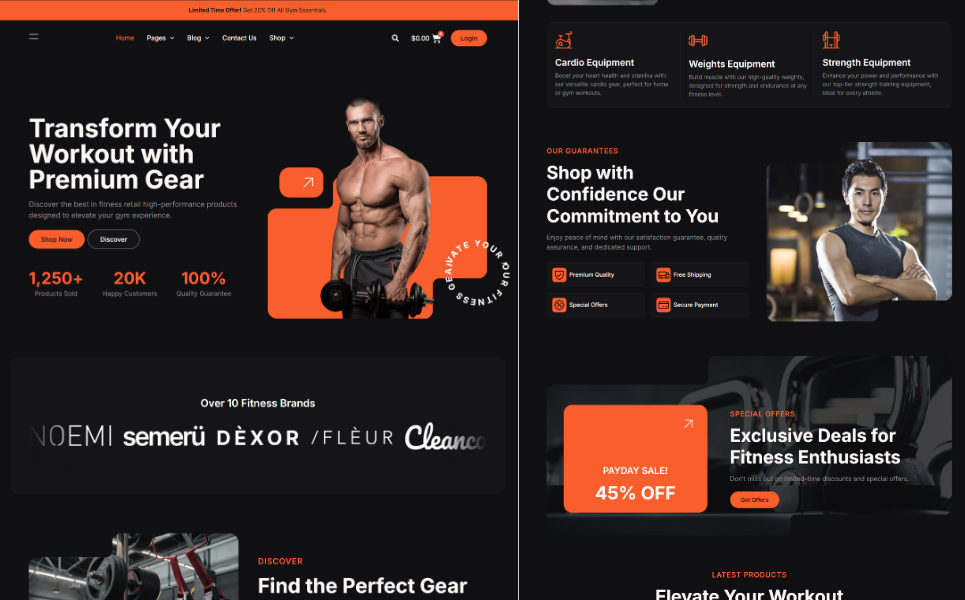 Welcome to FitPro, a professional Elementor Template Kit crafted for the fitness and wellness retail sector. Whether you operate a gym equipment store, sell athletic wear, or run online fitness programs, FitPro delivers a stylish and powerful platform to showcase your brand. With its bold dark-themed design, this kit is built to attract fitness enthusiasts and health-conscious shoppers, helping your business stand out in a competitive marketplace.