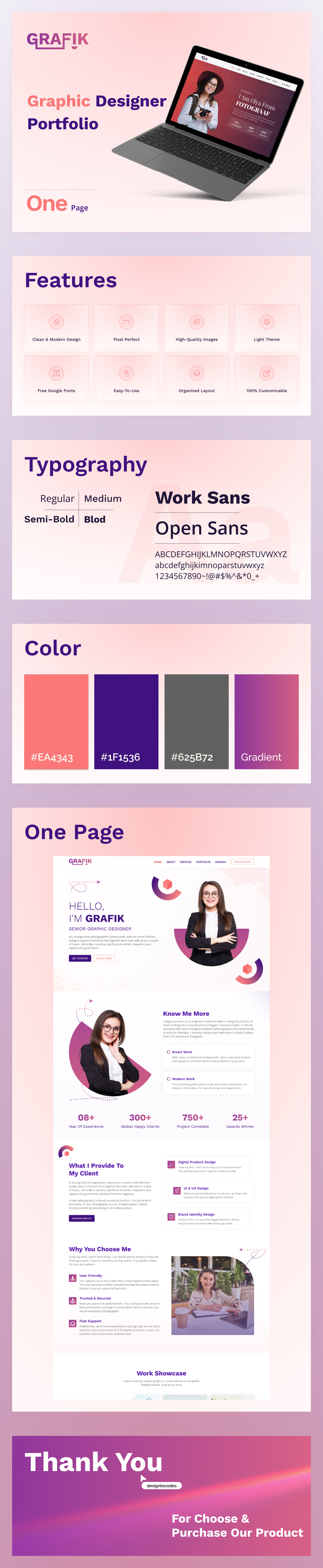 Grafik is a sleek, modern, and fully responsive one-page portfolio template designed for graphic designers. It's built with Elementor, the world's leading drag-and-drop page builder. Our Grafik is perfect for graphic designers, creative professionals, and agencies. This template allows you to showcase your work in a clean, visually captivating layout that reflects your design aesthetics.