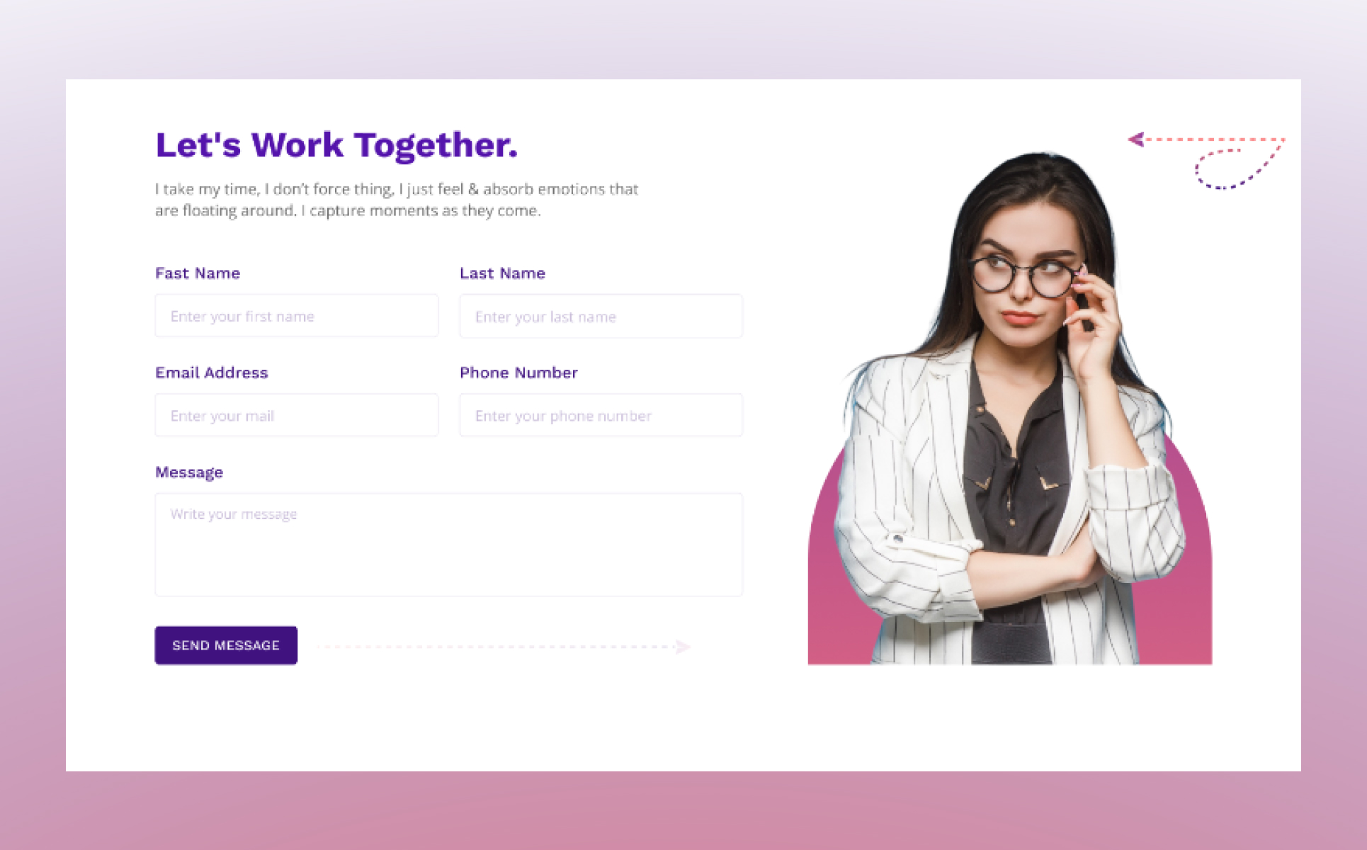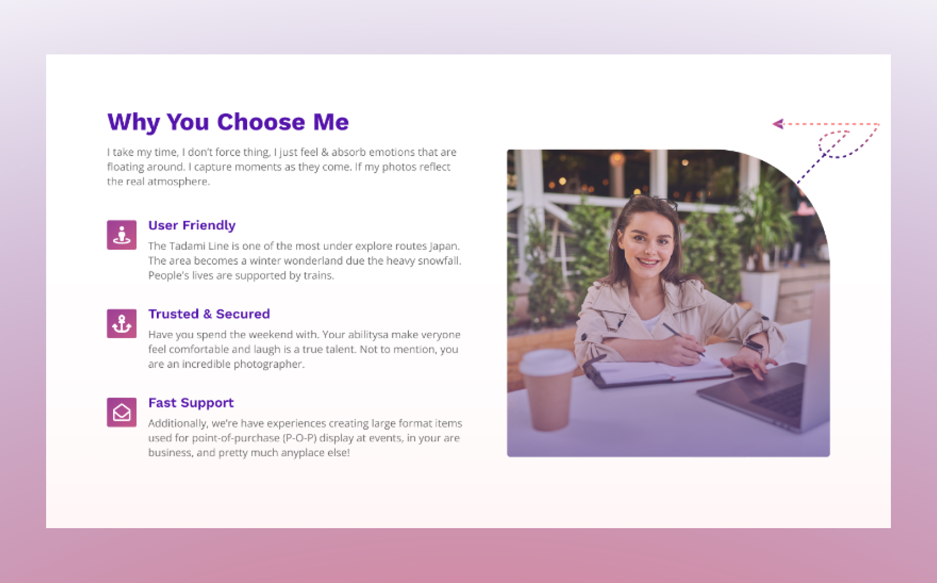 One-Page Parallax Design This modern, single-page layout ensures smooth, scrolling navigation that allows visitors to browse your portfolio, services, testimonials, and contact information in one seamless experience. The parallax effects and elegant transitions create a polished, professional look.