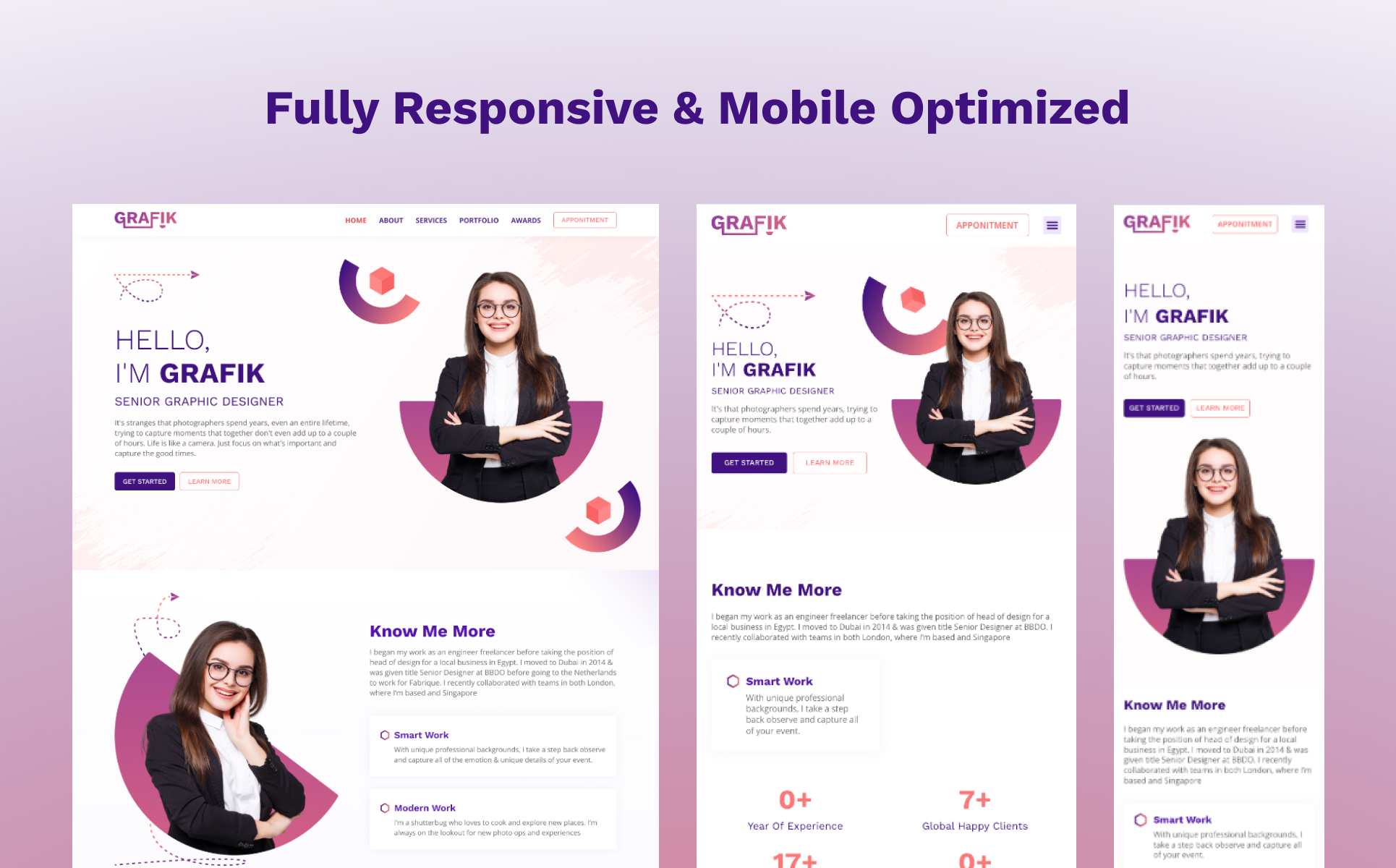 Fast Loading & Lightweight Speed matters, and Grafik delivers lightning-fast page loads thanks to its lightweight code and performance optimization. This keeps your visitors engaged and helps reduce bounce rates.