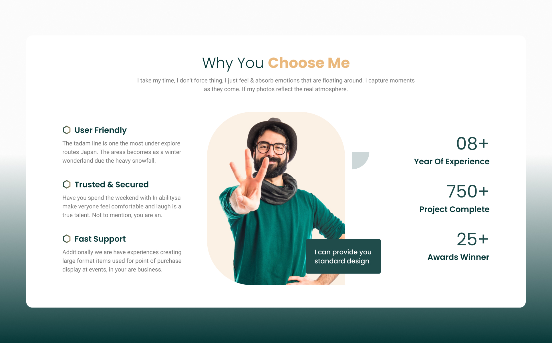 Crafted with Elementor, this portfolio template offers easy drag-and-drop customization, perfect for designers who want complete control over their presentation. The modern layout highlights your best projects, client testimonials, and design services in a visually stunning format that captures attentions.