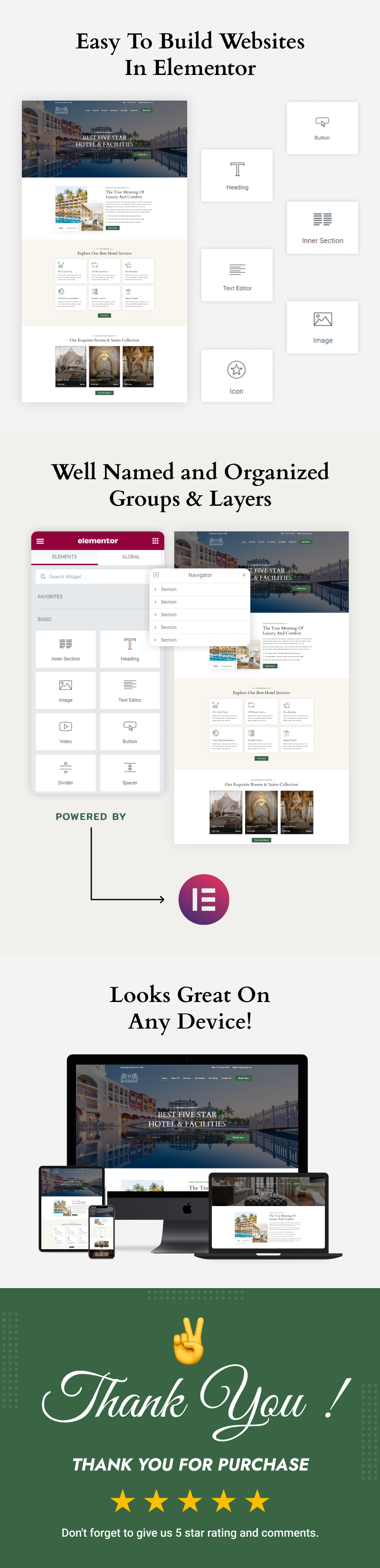 No coding experience is required to fully customize the per-designed pages and sections included in this Elementor Template Kit. Heaven Stay makes it easy to update images, modify content, and align the design with your brand, whether you're creating a brand-new Elementor website for your hotel or updating an old one. The sleek, contemporary design is perfect for emphasizing opulent extras, room specifics, offerings, and client testimonials.