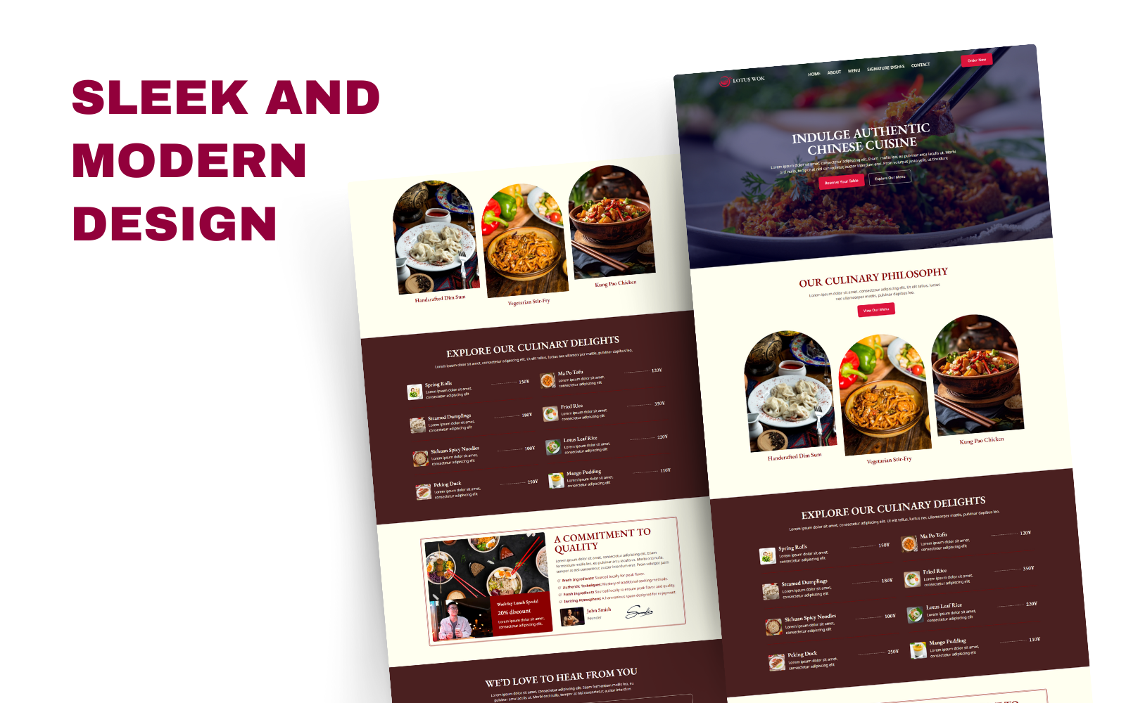 Spice up your online presence with Lotus Wok — Chinese Restaurant Elementor Landing Page, the ideal template for showcasing your authentic Chinese cuisine. Designed specifically for Chinese restaurants, takeout services, and Asian cuisine eateries, this Elementor template features a visually appealing and modern layout that draws customers in. Whether you're offering dine-in experiences, online orders, or delivery services, Lotus Wok helps you create a captivating landing page that promotes your dishes and attracts food lovers.