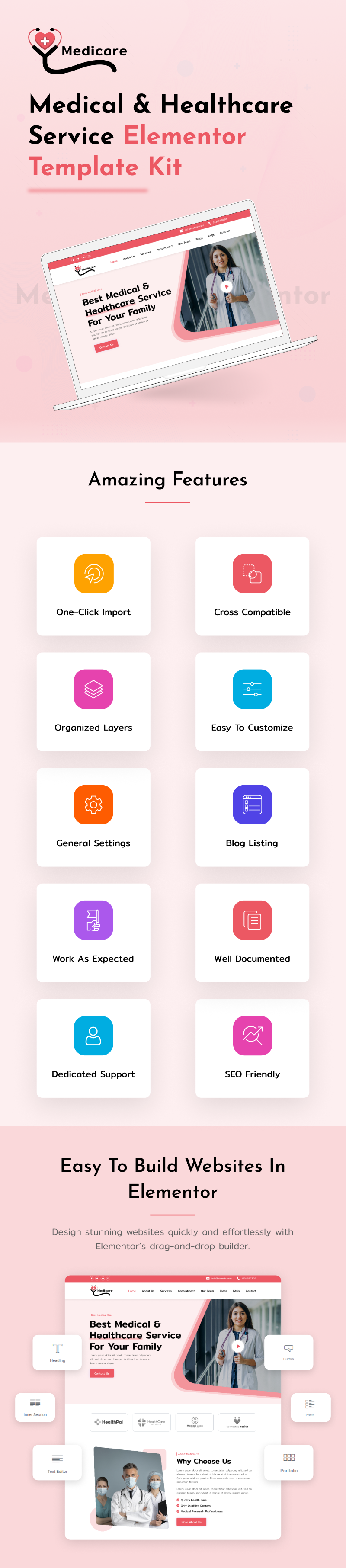 The Medicare Elementor Template Kit offers a comprehensive, multi-page layout specifically designed for hospitals, large medical clinics, specialised doctors, dentists, and general healthcare service providers. Featuring a professional, trustworthy, and modern design, this kit is built using the Elementor Pro plugin, making it the perfect foundation for a robust and responsive WordPress website optimised for the Hello Elementor theme.