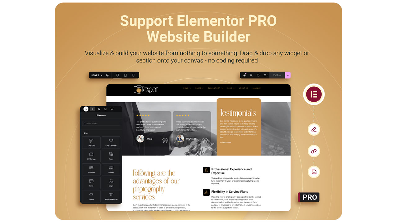 With two homepage styles—Classic & Modern, Nexoot ensures that your portfolio stands out—whether you're capturing the magic of weddings, the aesthetic of photoshoot or the precision of product photography. Built with Elementor, it’s incredibly easy to customize. No coding, no hassle—just a few clicks, and your website is ready to impress.