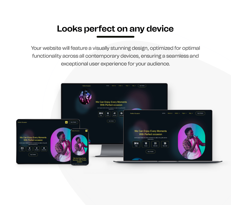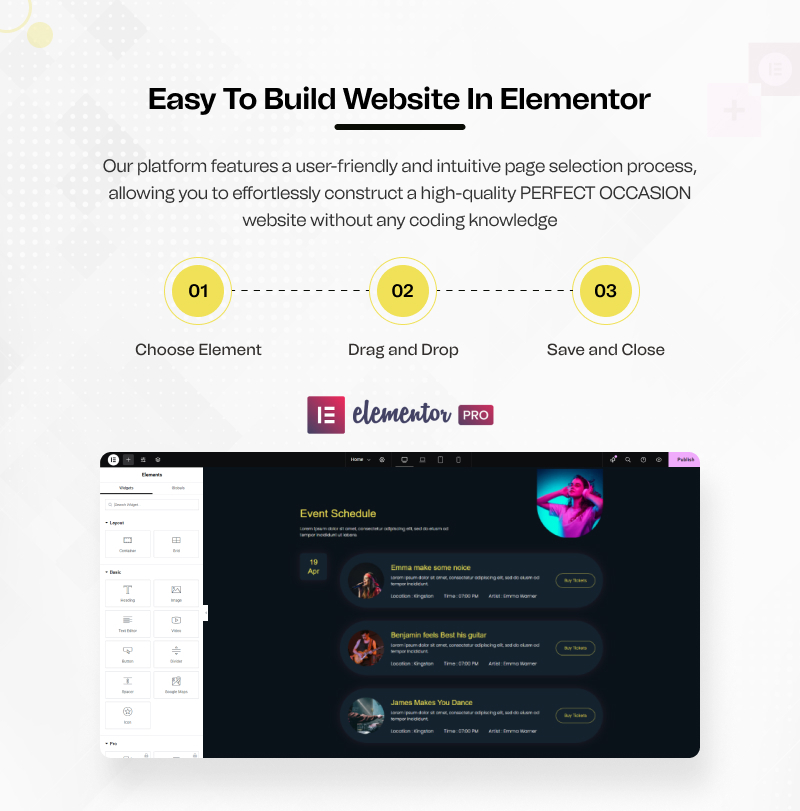 Perfect Occasion is a modern and visually striking WordPress Elementor Template Kit designed for music events, concerts, festivals, entertainment shows, and artist portfolios. It’s ideal for showcasing great artists, event schedules, pricing plans, and gallery highlights.