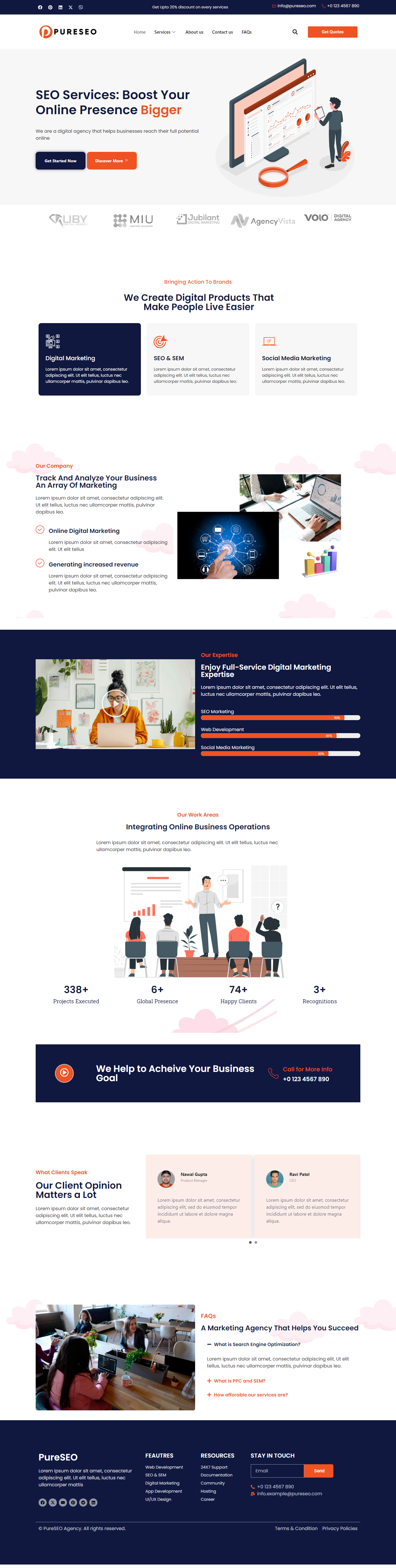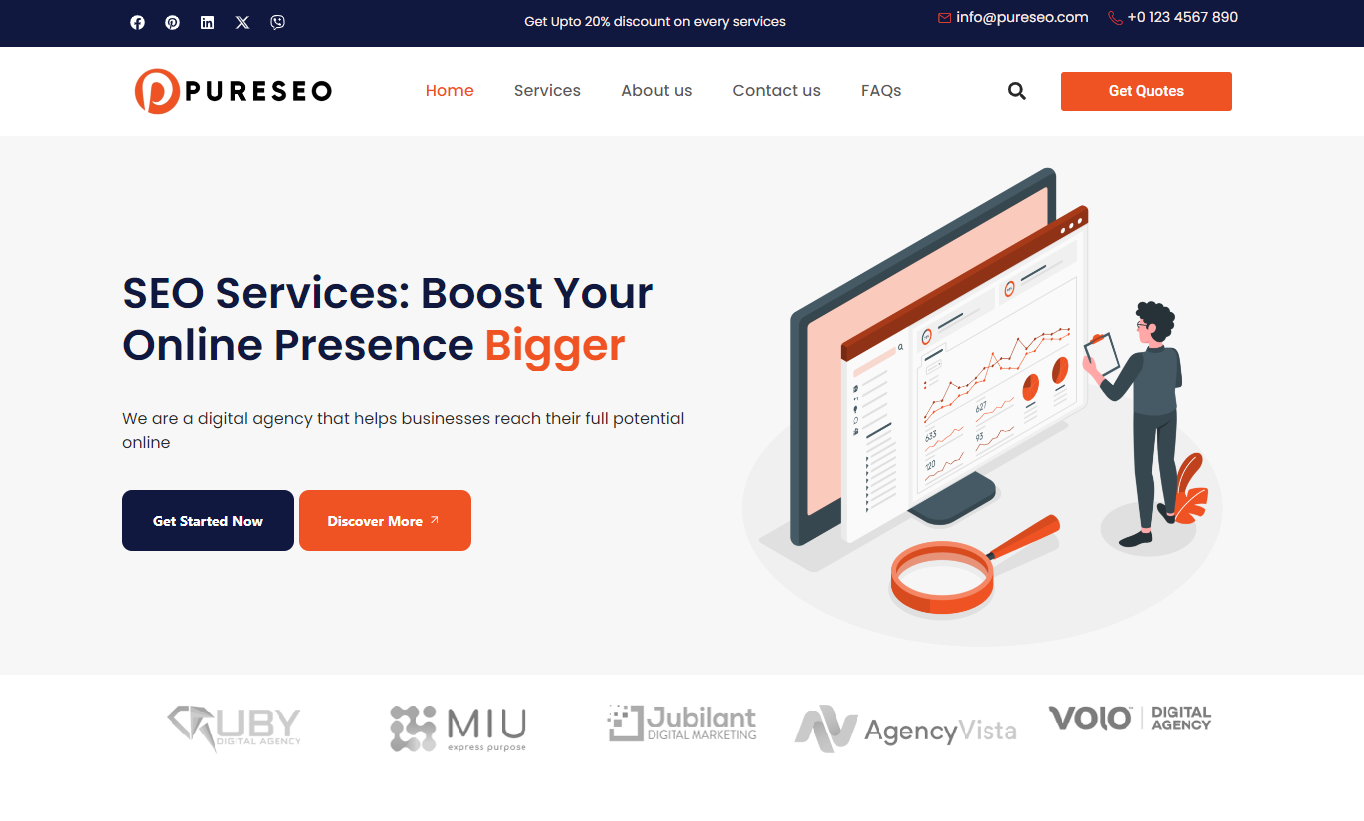 PureSEO Digital Marketing Agency Template kit premium and creative design used for SEO Agency, Online Marketing, Digital Marketing, Social Media website etc and it is the perfect foundation for your SEO business website. Start optimizing your online success today. PureSEO is an amazing WordPress template particularly created for an SEO site, digital marketing agency and social media marketing agency. This is a modernly outlined theme that is sure to capture the attention of your visitors.